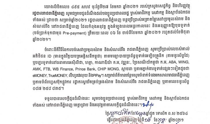 ទទួលបានសេចក្តីជូនដំណឹងនេះ សូមបងប្អូនប្រជាពលរដ្ឋ ម្ចាស់អាជីវកម្ម សេវាកម្ម និងស្ថាប័នឯកជន ទាំងអស់ នៅរាជធានីភ្នំពេញ មេត្តាជ្រាប និងអនុវត្តតាមសេចក្តីជូនដំណឹងនេះ៕
