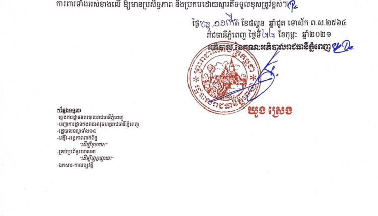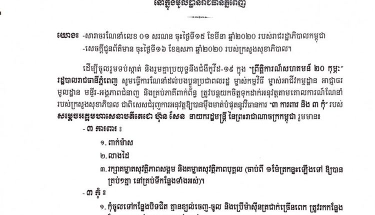 ជាមួយគ្នានេះ រដ្ឋបាលរាជធានីភ្នំពេញក៏បានចេញសេចក្តីជូនដំណឹងមួយ ជុំវិញវិធានការ ដើម្បីបង្ការទប់ស្កាត់នូវការរីករាលដាលនៃជម្ងឺនេះផងដែរ ។ ក្នុងសេចក្តីជូនដំណឹងនេះគឺបានធ្វើការណែនាំដល់បងប្អូនប្រជាពលរដ្ឋ ម្ចាស់កម្មវិធីម្ចាស់អាជីវកម្មដ្ឋាន និងគ្រប់ភាគីពាក់ព័ន្ធ ត្រូវចូលរួម អនុវត្តឱ្យម៉ឺងម៉ាត់បំផុតនូវ “វិធានការគម្លាតសុវត្ថិភាពសង្គម និងគម្លាតសុវត្ថិភាពបុគ្គល” ។ ក្នុងករណីនៅតែ មិនព្រមអនុវត្តតាមវិធានការណែនាំរបស់ក្រសួងសុខាភិបាល និងវិធានការរបស់ប្រមុខរាជរដ្ឋាភិបាល ម្ចាស់កម្មវិធី និងម្ចាស់អាជីវកម្មដ្ឋាន ត្រូវប្រឈមមុខនឹងការបិទកម្មវិធី ឬអាជីវកម្មដ្ឋានព្រមទាំងត្រូវទទួលទោសទណ្ឌទៅតាមច្បាប់ និងលិខិតបទដ្ឋានគតិយុត្តជាធរមានថែមទៀត៕