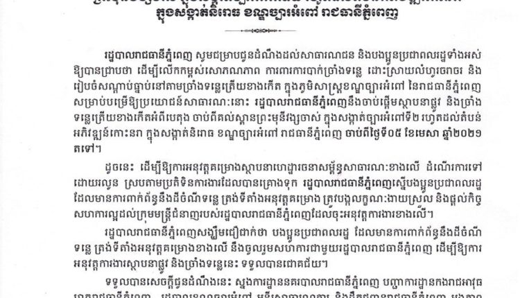 នេះយោងតាមសេចក្តីជូនដំណឹងរបស់រដ្ឋបាលរាជធានីភ្នំពេញ ដែលសារព័ត៌មានយើងទទួលបាននៅព្រឹកថ្ងៃទី២៦ មិនានេះ ដែលក្នុងសេចក្តីជូនដំណឹងនេះមានន័យថា៖