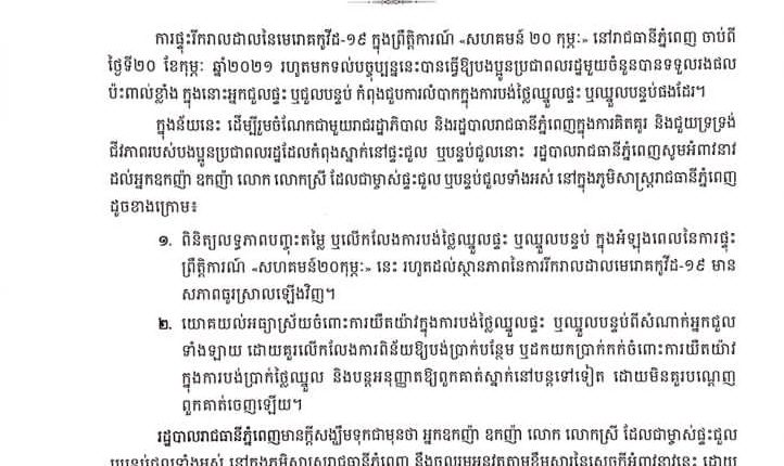 ក្នុងន័យនេះ ដើម្បីរួមចំណែកជាមួយរាជរដ្ឋាភិបាល និងរដ្ឋបាលរាជធានីភ្នំពេញក្នុងការគិតគូរ និងជួយទ្រទ្រង់ ជីវភាពរបស់បងប្អូនប្រជាពលរដ្ឋដែលកំពុងស្នាក់នៅផ្ទះជួល ឬបន្ទប់ជួលនោះ រដ្ឋបាលរាជធានីភ្នំពេញសូមអំពាវនាវ ដល់អ្នកឧកញ៉ា ឧកញ៉ា លោក លោកស្រី ដែលជាម្ចាស់ផ្ទះជួល ឬបន្ទប់ជួលទាំងអស់ នៅក្នុងភូមិសាស្ត្ររាជធានីភ្នំពេញ ដូចខាងក្រោម៖
