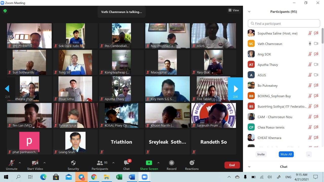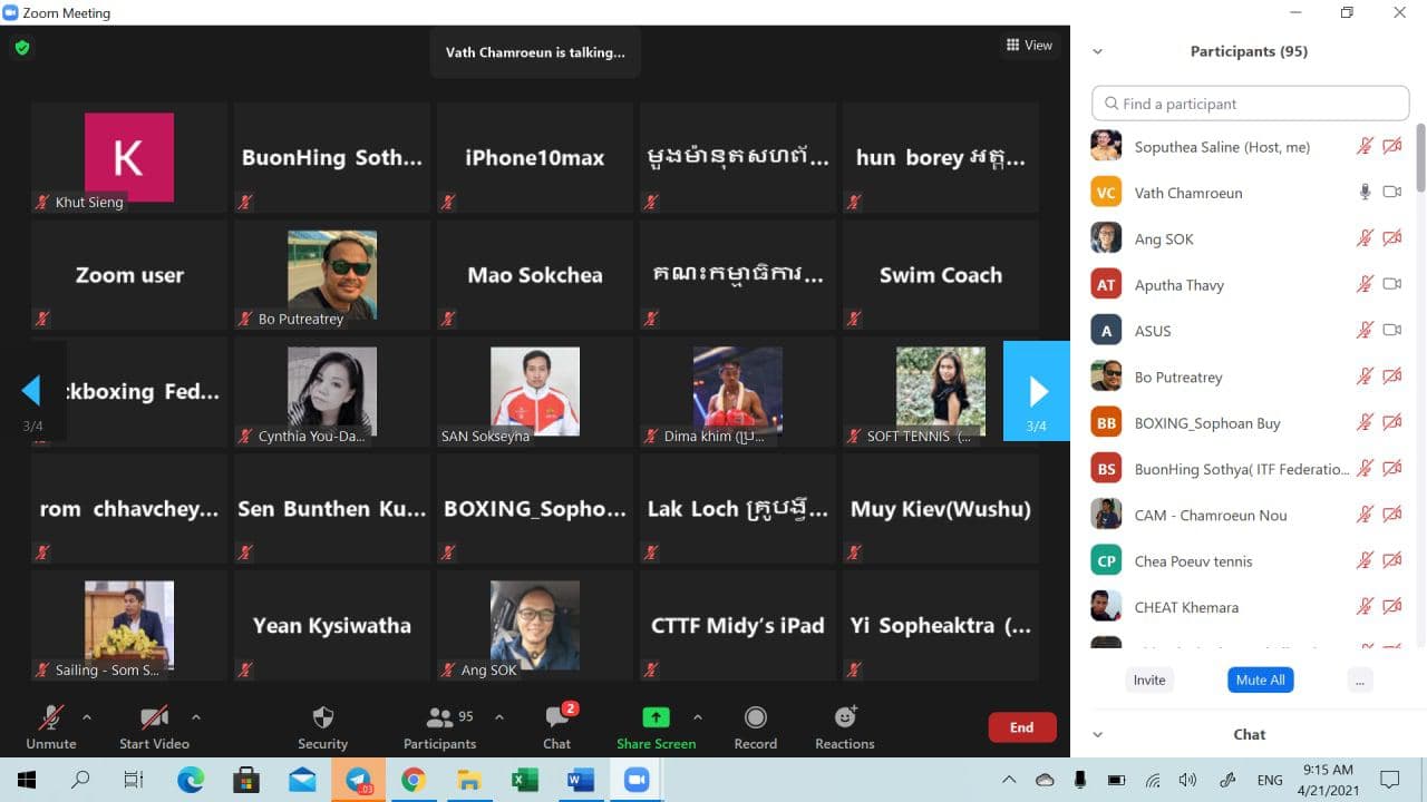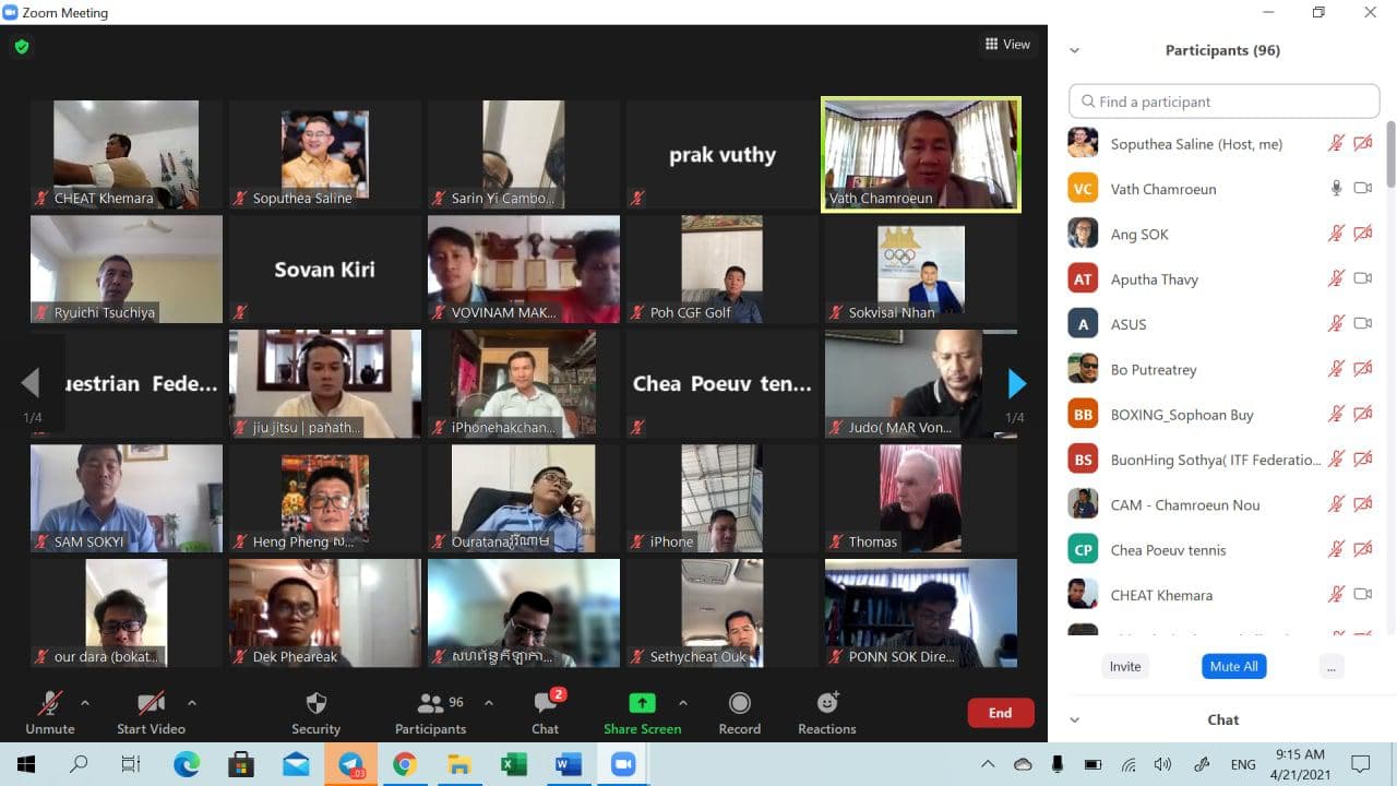 ភ្នំពេញ៖លោក វ៉ាត់ ចំរើន អគ្គលេខាធិការនៃគណៈកម្មាធិការជាតិរៀបចំ SEA GAMES “CAM SOC” ២០២៣ និងគណៈកម្មាធិការជាតិអូឡាំពិកកម្ពុជា លោក អ៊ុក សិទ្ធិជាតិ អគ្គនាយកនៃអគ្គនាយកដ្ឋានកីឡា និងលោក ប៉ុន សុខ ប្រធានមជ្ឈមណ្ឌលជាតិហ្វឹកហ្វឺនកីឡានាថ្ងៃទី២១ ខែមេសា ឆ្នាំ២០២១បានបើកកិច្ចប្រជុំស្តីពីស្វ័យហ្វឹកហាត់ Self Training ត្រៀមលក្ខណៈឲ្យបានប្រសើរ របស់ក្រុមជម្រើសជាតិ SEA GAMES សម្រាប់ចូលរួមប្រកួតកីឡា SEA GAMES នៅចុងឆ្នាំ២០២១ នៅប្រទេសវៀតណាមតាមអនឡាញ។