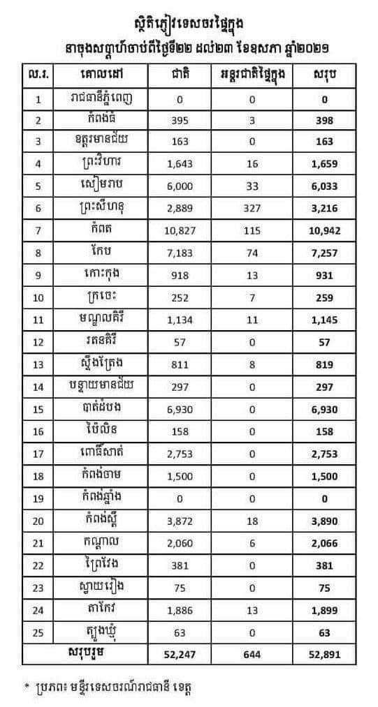 ភ្នំពេញ៖ បើយោងតាមប្រភពពីក្រសួងទេសចរណ៍ បានបញ្ជាក់ឲ្យដឹងថា៖ ក្នុងឱកាសថ្ងៃចុងសប្តាហ៍ទីបីនៃខែឧសភា ចាប់ពីថ្ងៃទី២២-២៣ ២៤ ខែឧសភា ឆ្នាំ២០២១ នៅទូទាំងប្រទេសកម្ពុជា ទទួលបានភ្ញៀវទេសចរសរុប ៥២,៨៩១ នាក់ កើនឡើង ៦.១១% ធៀបនឹងចុងសប្តាហ៍កន្លងទៅ ក្នុងនោះមានភ្ញៀវជាតិ ៥២,២៤៧ នាក់ កើនឡើង ៥.៨៤% និងភ្ញៀវបរទេសផ្ទៃក្នុង ៦៤៤ នាក់ កើនឡើង ១៣.៧៨%។ នេះបើតាមលោកថោង ខុន រដ្ឋមន្ត្រីក្រសួងទេសចរណ៍ មានប្រសាសន៍ នាថ្ងៃទី២៤ ខែឧសភានេះ។