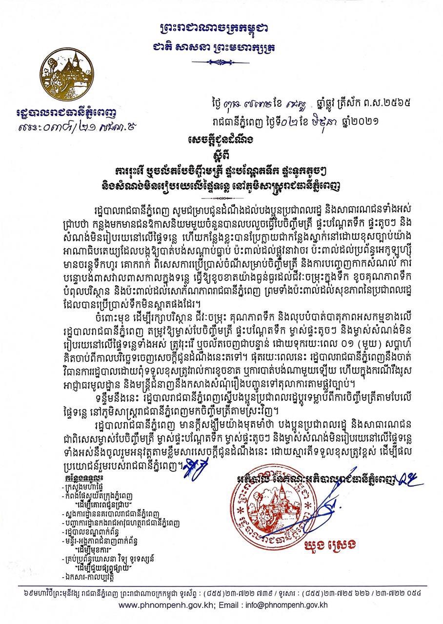 រដ្ឋបាលរាជធានីភ្នំពេញ មានក្តីសង្ឃឹមយ៉ាងមុតមាំថា បងប្អូនប្រជាពលរដ្ឋ និងសាធារណជន ជាពិសេសម្ចាស់បែចិញ្ចឹមត្រី ម្ចាស់ផ្ទះបណ្តែតទឹក ម្ចាស់ផ្ទះតូចៗ និងម្ចាស់សំណង់មិនរៀបរយនៅលើផ្ទៃទន្ល ទាំងអស់នឹងចូលរួមអនុវត្តតាមខ្លឹមសារសេចក្តីជូនដំណឹងនេះ ដោយស្មារតីទទួលខុសត្រូវខ្ពស់ ដើម្បីផលប្រយោជន៍រួមរបស់រាជធានីភ្នំពេញ៕