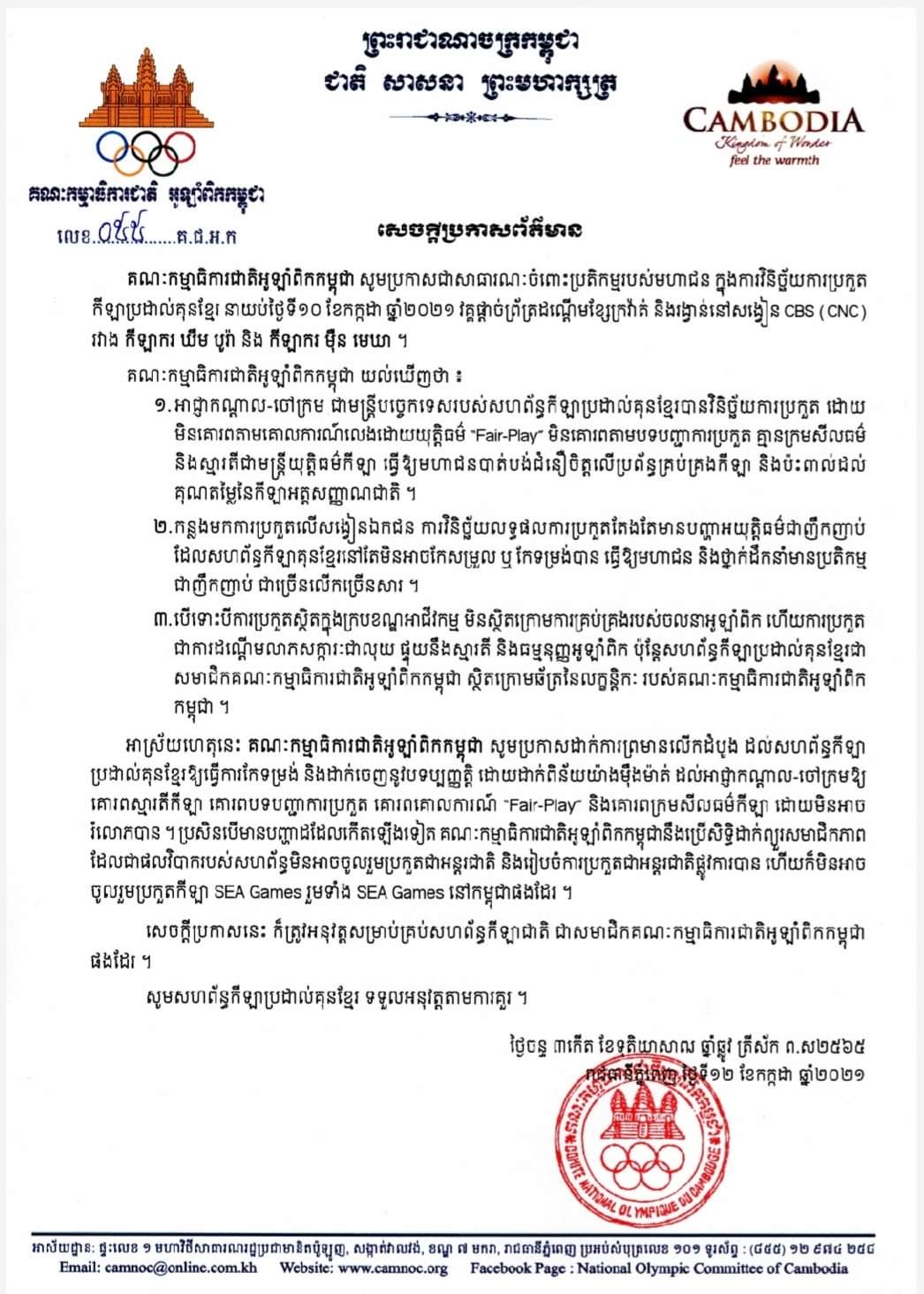 សូមអានសេចក្ដីប្រកាសព័ត៌មានរបស់គណៈកម្មាធិការជាតិអូឡាំពិកកម្ពុជា(NOCC) ដូចខាងក្រោម៖