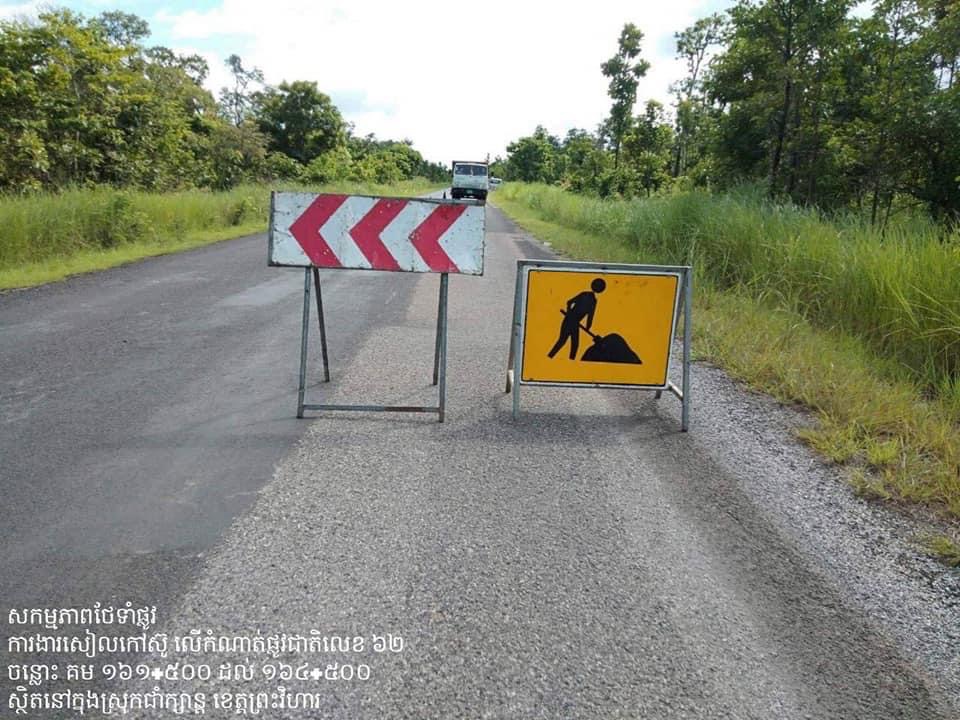 លោក សំ លាងទ្រី ប្រធានមន្ទីរសាធារណការនិងដឹកជញ្ជូនខេត្តព្រះវិហារបានអោយដឹងថា បើទោះបីប្រទេសកម្ពុជាកំពុងស្ថិតក្នុងតំណាក់កាលនៃការបង្ការ ទប់ស្កាត់និងជម្ងឺកូវីដ–១៩ក៏ពិតមែន អនុវត្តតាមការណែនាំរបស់លោកទេសរដ្ឋមន្ត្រី ស៊ុន ចាន់ថុល រដ្ឋមន្ត្រីក្រសួងសាធារណការនិងដឹកជញ្ជូននិងលោក ប្រាក់ សុវណ្ណ អភិបាលខេត្តព្រះវិហារ ក្រុមការងារថែទាំផ្លូវថ្នល់របស់មន្ទីរសាធារណការ និងដឹកជញ្ជូន ខេត្តព្រះវិហារ បាននិងកំពុងស្រោចកៅស៊ូ សៀលលុបស្នាមប្រេះ ក្រាលដីល្បាយថ្ម និងកៀរសម្រួលផ្លូវ ចំនួន៣ខ្សែ ក្នុងនោះរួមមាន៖ ក្រុមការងារថែទាំផ្លូវជាតិលេខ៦២ ថ្ងៃនេះបន្ត ស្រោចកៅស៊ូ សៀលលុបស្នាមប្រេះ គីឡូម៉ែត្រ 161+500 ដល់ គីឡូម៉ែត្រ164+500 ស្ថិតក្នុងស្រុកជាំក្សាន្ត ខេត្តព្រះវិហារ។