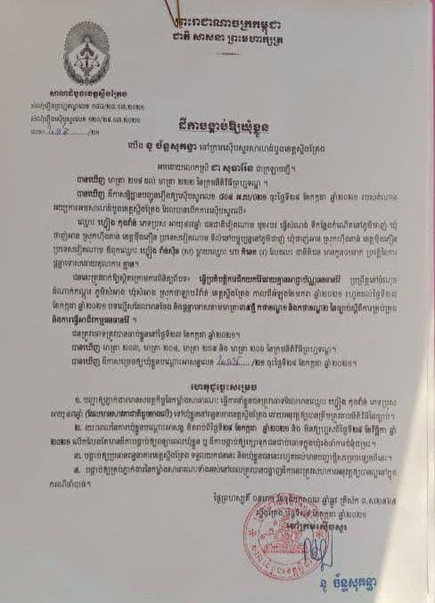 ស្ទឹងត្រែង៖ លោក នូ ច័ន្ទសុគន្ធា ចៅក្រមស៉ើបសួរ នៃសាលាដំបូងខេត្តស្ទឹងត្រែងបានចេញដីកាបង្គាប់ឲ្យឃុំខ្លួនមនុស្ស៣នាក់ ដាក់ពន្ធនាគារនៅថ្ងៃទី២៩ ខែកក្កដា ឆ្នាំ២០២១ ពាក់ព័ន្ធការលួចធ្វើអាជីវកម្មរ៉ែដោយខុសច្បាប់នៅខេត្តស្ទឹងត្រែង។