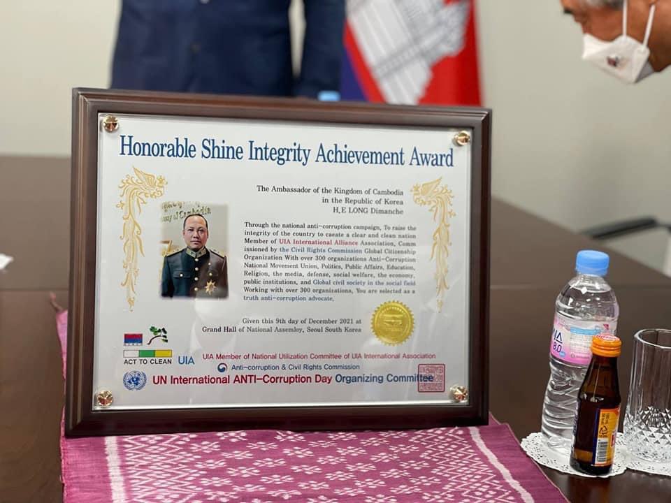 លោកឡុងឌីម៉ង ឯកអគ្គរាជទូតកម្ពុជាប្រចាំសាធារណរដ្ឋកូរ៉េខាងត្បូង បានមានប្រសាសន៍លើកឡើងថា ៖ ស្ថានទូតកម្ពុជាប្រចាំនៅសាធារណរដ្ឋកូរ៉េ ពិតជាមានមោទនភាព និងកិត្តិយស សម្រាប់ពានរង្វាន់ Honorable Shine Integrity Achievement Award ពីសហព័ន្ធចលនាសង្គមស៊ីវិលប្រឆាំងអំពើពុករលួយកូរ៉េ ដែលបណ្ដុំដោយជាង៣០០ សមាគមចលនា និងសហជីពដែលធ្វើសកម្មភាពប្រឆាំងអំពើពុករលួយនៅក្នុងវិស័យនយោបាយ កិច្ចការរដ្ឋបាលសាធារណៈ អប់រំ សាសនា សារព័ត៌មាន ការពារជាតិ សង្គមកិច្ច និងសេដ្ឋកិច្ច។