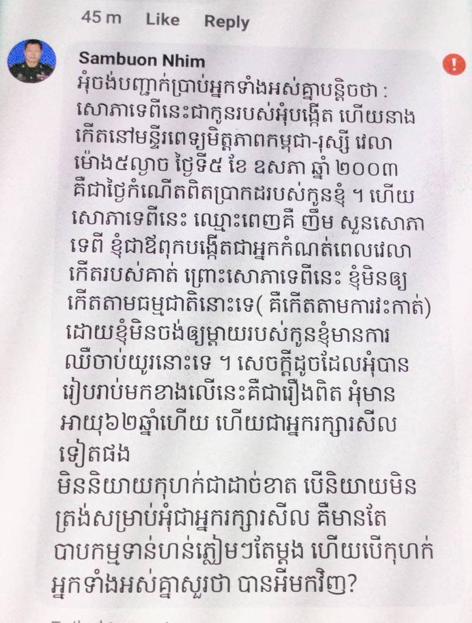 ក្នុងនោះលោកបានរៀបរាប់ថា៖ អ៊ុចង់បញ្ជាក់ប្រាប់អ្នកទាំងអស់គ្នាបន្តិចថា សោភា ទេពី នេះជាកូនស្រីរបស់អ៊ុបង្កើត ហើយនាងកើតនៅមន្ទីរពេទ្យមិត្តភាពកម្ពុជា-រុស្សី វេលាម៉ោង ៥ល្ងាចថ្ងៃទី ៥ ខែឧសភា ឆ្នាំ ២០០៣ គឺជាថ្ងៃកំណើតពិតប្រាកដរបស់កូនខ្ញុំ» ។