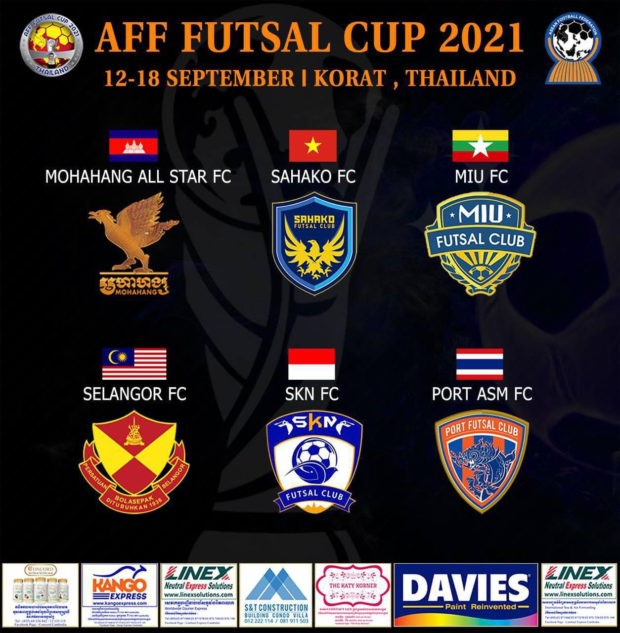 ភ្នំពេញ៖យោងតាមការប្រកាសរបស់សហព័ន្ធសហព័ន្ធកីឡាបាល់ទាត់អាស៊ាន(AFF)បានឲ្យដឹងថាព្រឹត្តិការណ៍ជើងឯកប្រចាំតំបន់អាស៊ាន “AFF Futsal Cup 2021” ឬហៅថា “AFF Futsal Club Championship”នឹងដំណើរការប្រកួត នាថ្ងៃទី១២ ដល់ថ្ងៃទី១៨ ខែកញ្ញា ឆ្នាំ២០២១ នៅ Nakhonn Ratchashima ប្រទេសថៃ។