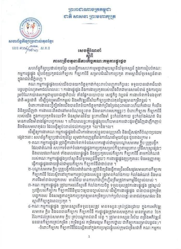 ៖ សហព័ន្ធកីឡាប្រដាល់គុនខ្មែរ ចេញសេចក្ដីណែនាំ ស្ដីពីការពង្រឹងតួនាទី ភារកិច្ច គណៈកម្មការផ្គូរផ្គង ដើម្បីជំរុញកិច្ចសហការ ជាមួយ ស្ថានីយ៍ទូរទស្សន៍ ក្នុងការរៀបចំគូប្រកួតដល់កីឡាករ – កីឡាការិនី ឲ្យបានល្អប្រសើរ