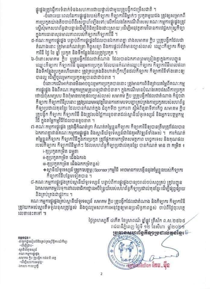 គណៈកម្មការផ្គូរផ្គងគ្រប់ស្ថានីយ៍ទូរទស្សន៍ សមាគម ក្លិប គ្រូបង្វឹកដែលជាតំណាង និងកីឡាករ កីឡាការិនី ត្រូវយកអស់ស្មារតីទទួលខុសត្រូវខ្ពស់ និងចូលរួមសហការអនុវត្តឲ្យមានប្រសិទ្ធភាពខ្ពស់ ចាប់ពីថ្ងៃចុះហត្ថ លេខានេះតទៅ ៕