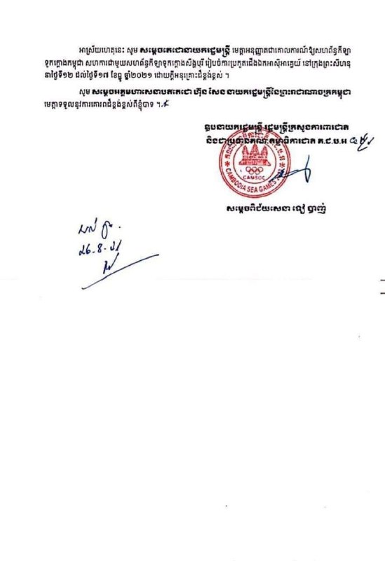 ការអនុញ្ញាតដ៏ខ្ពង់ខ្ពស់របស់សម្ដេចតេជោនាយករដ្ឋមន្ដ្រី ធ្វើឡើងក្រោយមានការស្នើសុំពីសម្ដេចពិជ័យសេនា ទៀ បាញ់ ឧបនាយករដ្ឋមន្ដ្រី រដ្ឋមន្ដ្រីក្រសួងការពារជាតិ និងជាប្រធានគណៈកម្មាធិការជាតិ រៀបចំការប្រកួតកីឡាអាស៊ីអាគ្នេយ៍ លើកទី៣២ ឆ្នាំ២០២៣ (CAMSOC) បន្ទាប់ពីអង្គសន្និបាតគណៈកម្មាធិការជាតិ CAMSOC បានគាំទ្រពេញទំហឹង ចំពោះគម្រោងសហការរៀបចំព្រឹត្តិការណ៍ថ្នាក់តំបន់ រវាងសហព័ន្ធកីឡាទូកក្ដោងកម្ពុជា និងសង្ហបុរី កាលពីថ្មីៗ ។