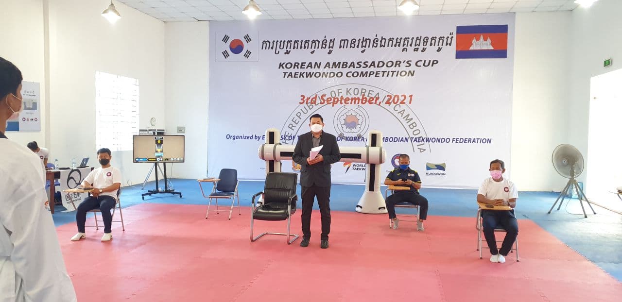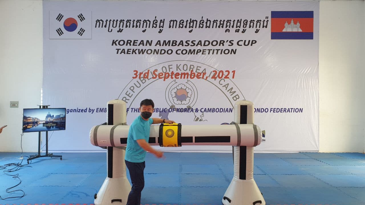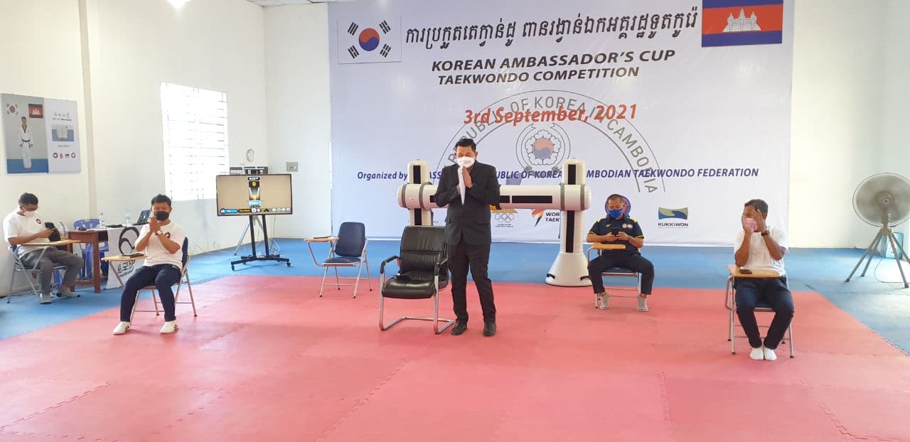 ភ្នំពេញ៖លោក ជ្រិន សុធា អគ្គលេខាធិការតំណាងឲ្យលោកបណ្ឌិតសភាចារ្យ ហង់ជួន ណារ៉ុន រដ្ឋមន្រ្តីក្រសួងអប់រំ យុវជន និងកីឡា និង ប្រធានខេមរសហព័ន្ធតេក្វាន់ដូ WT នៅព្រឹកថ្ងៃទី២៨ ខែសីហាឆ្នាំ២០២១ នាវិទ្យាស្ថានអប់រំកាយ និងកីឡា បានប្រកាសបើកជាផ្លូវការនៃការប្រកួតOnline 2021 Korean Ambassador`s Cup Taekwondo Competition ដែលប្រព្រឹត្តទៅ នាថ្ងៃទី២៨-២៩ខែសីហា ឆ្នាំ២០១ នៅភ្នំពេញ ខេមរសហព័ន្ធបានដាក់១២វិញ្ញាសា សម្រាប់ការប្រកួតក្នុងនោះវិញ្ញសា សម្តែងមេគុន១០វិញ្ញាសា និងប្រយុទ្ធបច្ចេកទេស២វិញ្ញាសា។