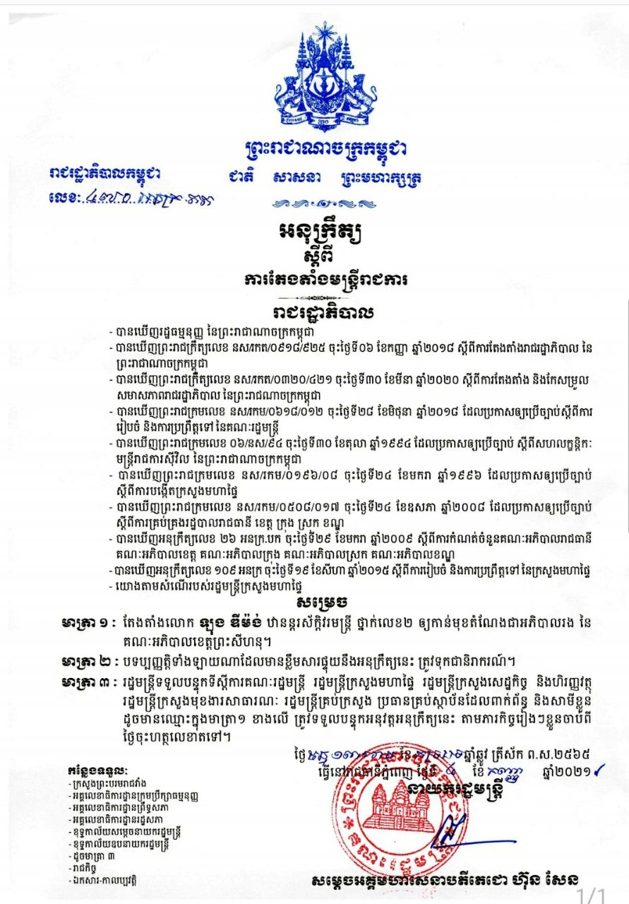 នេះបើយោងតាមអនុក្រឹត្យដែលចុះហត្ថលេខាដោយសម្ដេចអគ្គមហាសេនាបតីតេជោហ៊ុនសែននាយករដ្ឋមន្ត្រីនៃព្រះរាជាណាចក្រកម្ពុជា នៅថ្ងៃទី ០៤ ខែតុលាឆ្នាំ២០២១នេះ៕