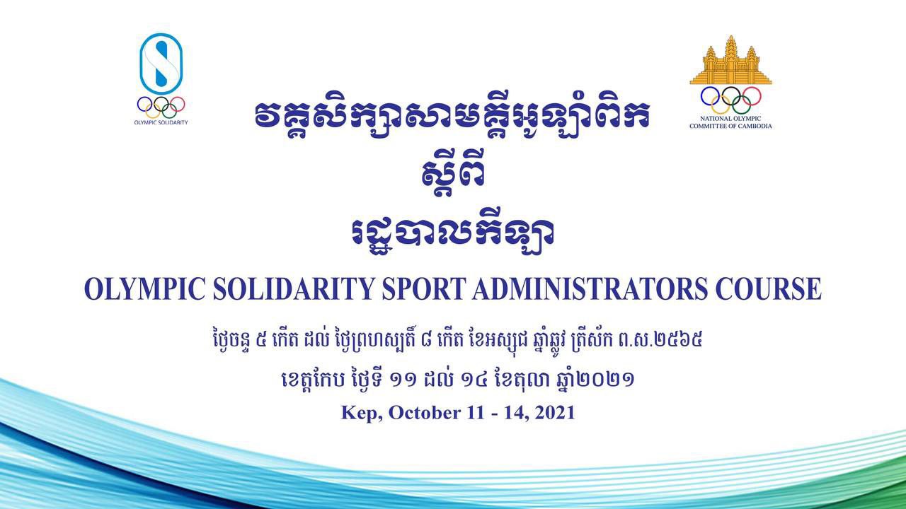 ភ្នំពេញ៖ វគ្គសិក្សាសាមគ្គីអូឡាំពិក ស្តីពីរដ្ឋបាលកីឡា ជាលើកទី៣ ក្នុងចំណោម ៤ វគ្គរបស់គណ:កម្មាធិការជាតិអូឡាំពិកកម្ពុជា (NOCC)សម្រាប់ឆ្នាំ ២០២១នេះ បានបណ្តុះបណ្តាលជូនដល់មន្ត្រី-ថ្នាក់ដឹកនាំកីឡា គ្រូអប់រំកាយ និងកីឡា នៅខេត្តកែប រយៈ ពេល ៤ថ្ងៃ ពីថ្ងៃទី១១ ដល់ថ្ងៃទី១៤ ខែ តុលា ឆ្នាំ ២០២១ ដោយសិក្សាតាមប្រព័ន្ធ Zoom ។