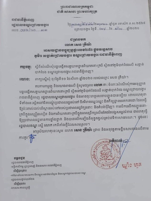 គួរបញ្ជាក់ថា៖ជុំវិញបញ្ហានេះ រដ្ឋបាលខណ្ឌជ្រោយចង្វា ក៏បានធ្វើលិខិត យោងពាក្យស្នើសុំ ចុះថ្ងៃទី១១ ខែសីហា ឆ្នាំ២០២០ របស់ឈ្មោះ សេន គ្រីយ៉ាផងដែរ គឺរដ្ឋបាលខណ្ឌជ្រោយចង្វា បានបដិសេធ ចំពោះសំណើសុំការអនុញ្ញាត បន្តបង្កើតសត្តឃាតដ្ឋានពិឃាតគោ-ក្របី ស្ថិតនៅភូមិបាក់ខែងលើ សង្កាត់បាក់ខែង ខណ្ឌជ្រោយចង្វារ រាជធានីភ្នំពេញ ដោយរដ្ឋបាលខណ្ឌជ្រោយចង្វារ មិនអាចចុះហត្ថលេខាបញ្ជូនបានឡើយ ដោយហេតុថា ទីតាំងនេះស្ថិតនៅជិតបណ្តុះប្រជាពលរដ្ឋរស់នៅ ជិតវិមានឈ្នះឈ្នះ ជិតកីឡដ្ឋានមរតកតេជោ ដែលធ្វើ ឱ្យប៉ះពាល់ដល់បរិស្ថានរស់នៅរបស់ប្រជាពលរដ្ឋក្បែរនោះ និងតំបន់ជុំវិញ។ទោះមិនមានការអនុញ្ញាងត្តពីអាជ្ញាធរហើយក្ដី តែសកម្មភាពអាជីវកម្មសត្វឃាតខាងលើនៅដំណើរការដដែលមកដល់សព្វថ្ងៃនេះ។ការបើកបរដឹកជញ្ជូនគោ ក្របីក្នុងល្បឿនលឿន និងការពិឃាតគោ-ក្របីក្នុងពេលព្រឹកព្រលឹមតែងតែបង្កសម្លេងរំខាន ជាហេតុធ្វើ ឱ្យប្រជាពលរដ្ឋមានការថ្នាំងថ្នាក់ និងបានលើកឡើងពីទុក្ខកង្វល់គ្រប់វេទិកាសាធារណៈនិងស្នើ អោយរកទីតាំងថ្មីដែលសមស្រប។ប៉ុន្តែទោះបីជាយ៉ាងណាក្តីទីតាំងរបស់លោកសេន គ្រីយ៉ានៅតែដំណើរការជាធម្មតា មិនខ្វល់ខ្វាយអ្វីឡើយ៕
