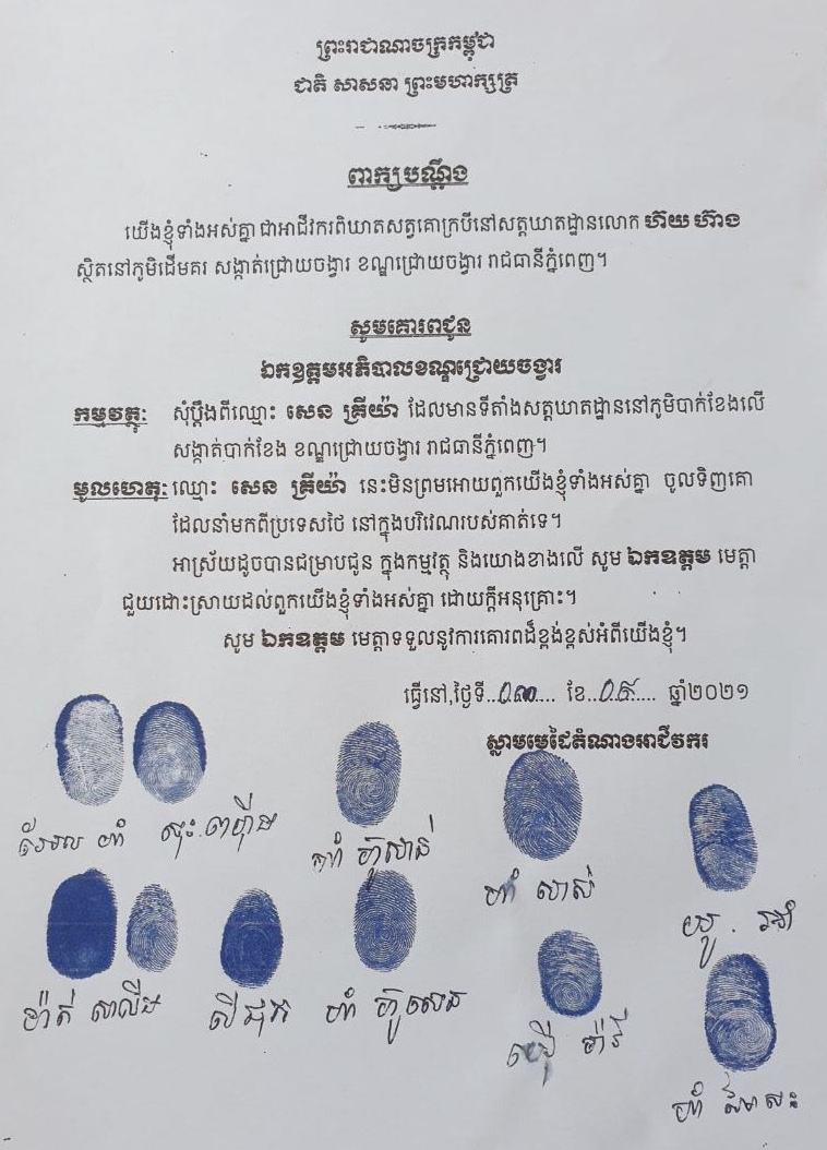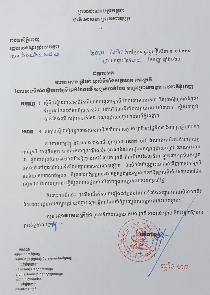 យោងតាមលិខិតរបស់សាលាខណ្ឌជ្រោយចង្វាចុះថ្ងៃទី១០ កញ្ញា ២០២១ ក្រោយពីមានពាក្យបណ្ដឹងសុំអន្តរាគមន៍របស់អាជីវករពិឃាតសត្វគោ-ក្របី ចុះថ្ងៃទី០៣ ខែកញ្ញា ឆ្នាំ២០២១ ក៏បានជំរាបមកលោក សេន គ្រីយ៉ា ម្ចាស់ទីតាំងសត្តឃាត គោ-ក្របី ដែលមានទីតាំងស្ថិតនៅភូមិបាក់ខែងលើ សង្កាត់បាក់ខែង ខណ្ឌជ្រោយចង្វារនេះថា៖ តំណាងអាជីវករពិឃាតសត្វ គោ-ក្របី ជាច្រើននាក់ បានដាក់ពាក្យបណ្តឹងសុំអន្តរាគមន៍មកអាជ្ញាធរខណ្ឌជ្រោយចង្វារ ដោយអះអាង ថាៈ ពួកគាត់ត្រូវបានគេហាមមិនឱ្យចូលទៅទិញគោ-ក្របី ពីអាជីវករដែលដឹកជញ្ជូនគោ-ក្របីមកស្តុក ទុកលក់នៅក្នុងបរិវេណទីតាំងសត្តឃាតរបស់លោកឡើយ និងមិនតែប៉ុណ្ណោះនៅពេលទិញបានគោ-ក្របី មកពិឃាតយកសាច់ម្តងៗ គឺត្រូវបង់តម្លៃក្បាលគោបន្ថែមក្នុងមួយក្បាលៗទៅឱ្យម្ចាស់ទីតាំងសត្តឃាតថែម ទៀតផង ដែលបញ្ហានេះធ្វើឱ្យពួកគាត់ជួបការលំបាកក្នុងការប្រកបមុខរបរប្រចាំថ្ងៃ។