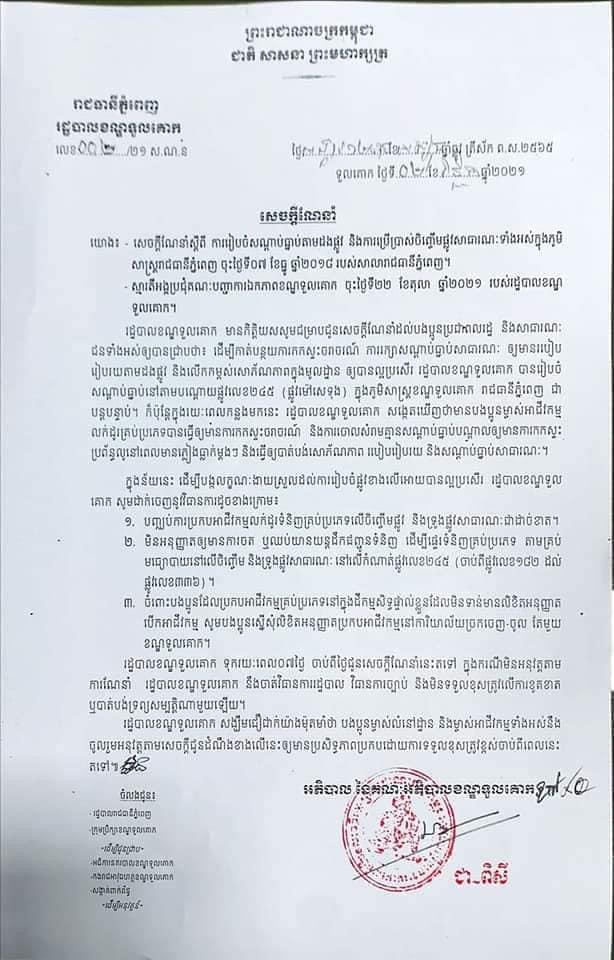ភ្នំពេញ៖ រដ្ឋបាលខណ្ឌទួលគោក បានសម្រេចដោយទុករយៈពេល០៧ថ្ងៃ ចំពោះម្ចាស់អាជីវកម្មគ្រប់ប្រភេទដែលបាននិងកំពុងលក់ដូរទំនិញនៅលេីកំណាត់ផ្លូវលេខ២៤៥(ចាប់ពីផ្លូវលេខ២៣០ ដល់ផ្លូវលេខ៣៣៦) ស្ថិតក្នុងសង្កាត់ផ្សារដេីមគរ និង សង្កាត់បឹងសាឡាង បើនៅតែរឹងទទឹងប្រកបអាជីវកម្មលក់ដូរទំនិញគ្រប់ប្រភេទនៅលើចិញ្ចើមផ្លូវ និងទ្រូងផ្លូវសាធារណៈទៀត រដ្ឋបាលខណ្ឌទួលគោក នឹងចាត់វិធានការរដ្ឋបាល វិធានការច្បាប់ និងមិនទទួលខុសត្រូវលើការខូតខាត ឬបាត់បង់ទ្រព្យសម្បត្តិណាមួយឡើយ។