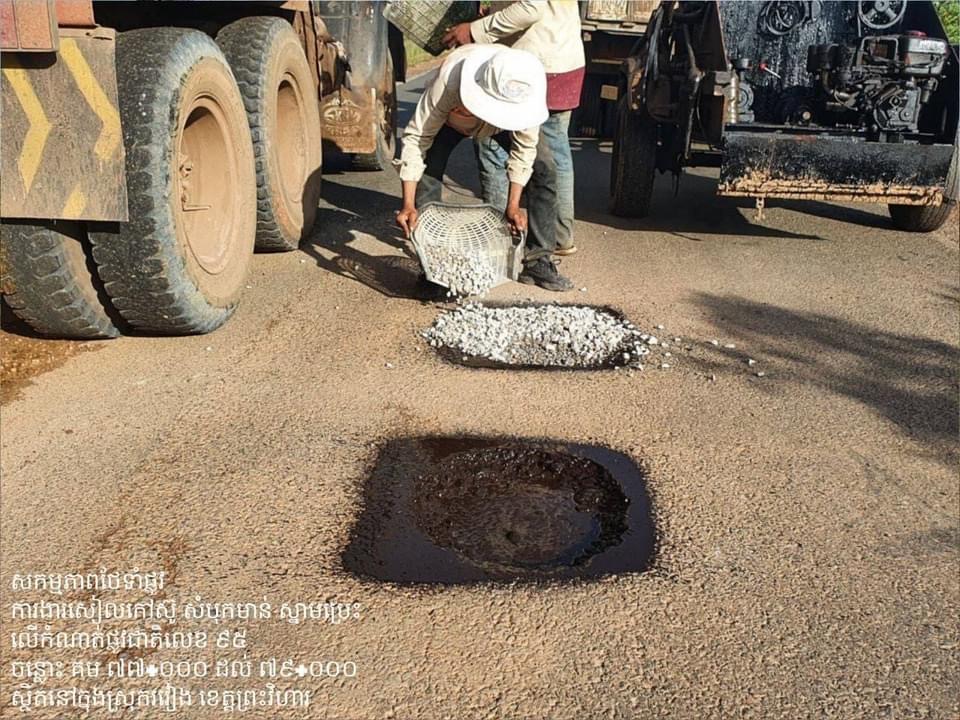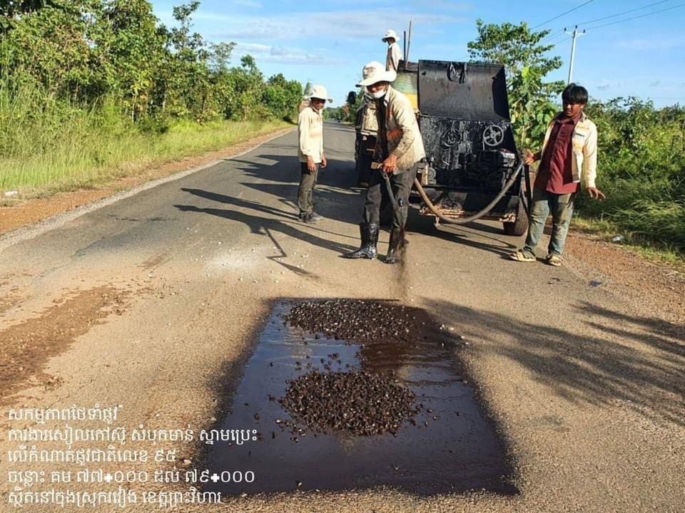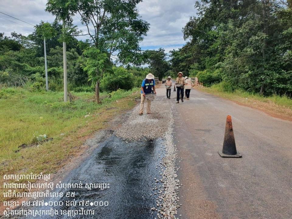 .ការងារថែទាំផ្លូវជាតិលេខ ៩៥ ដោយស្រោចកៅស៊ូ សៀលលុបស្នាមប្រេះ ស្ថិតក្នុងស្រុករវៀង ខេត្តព្រះវិហារ។