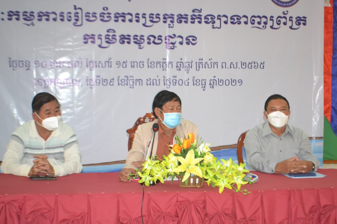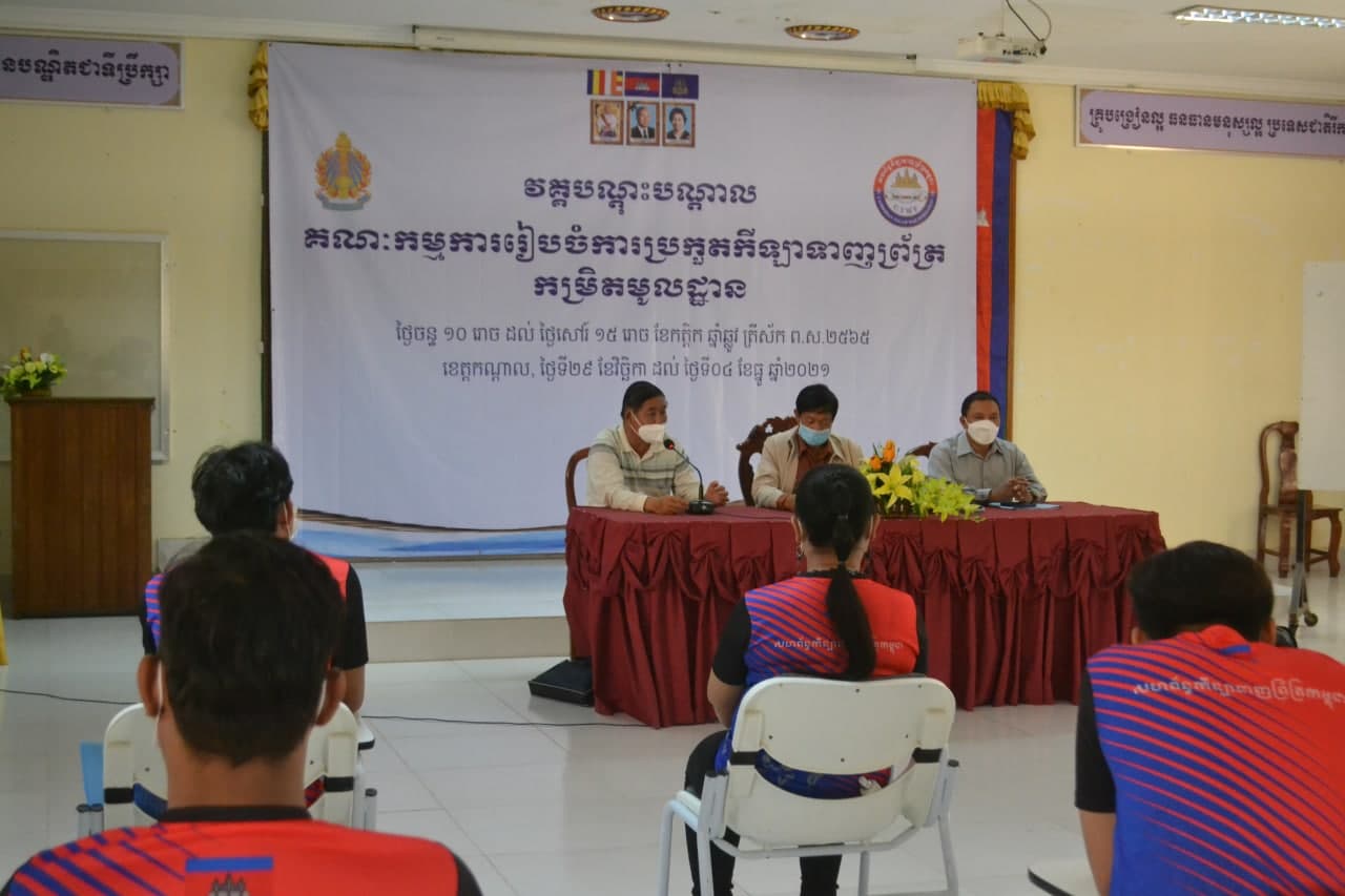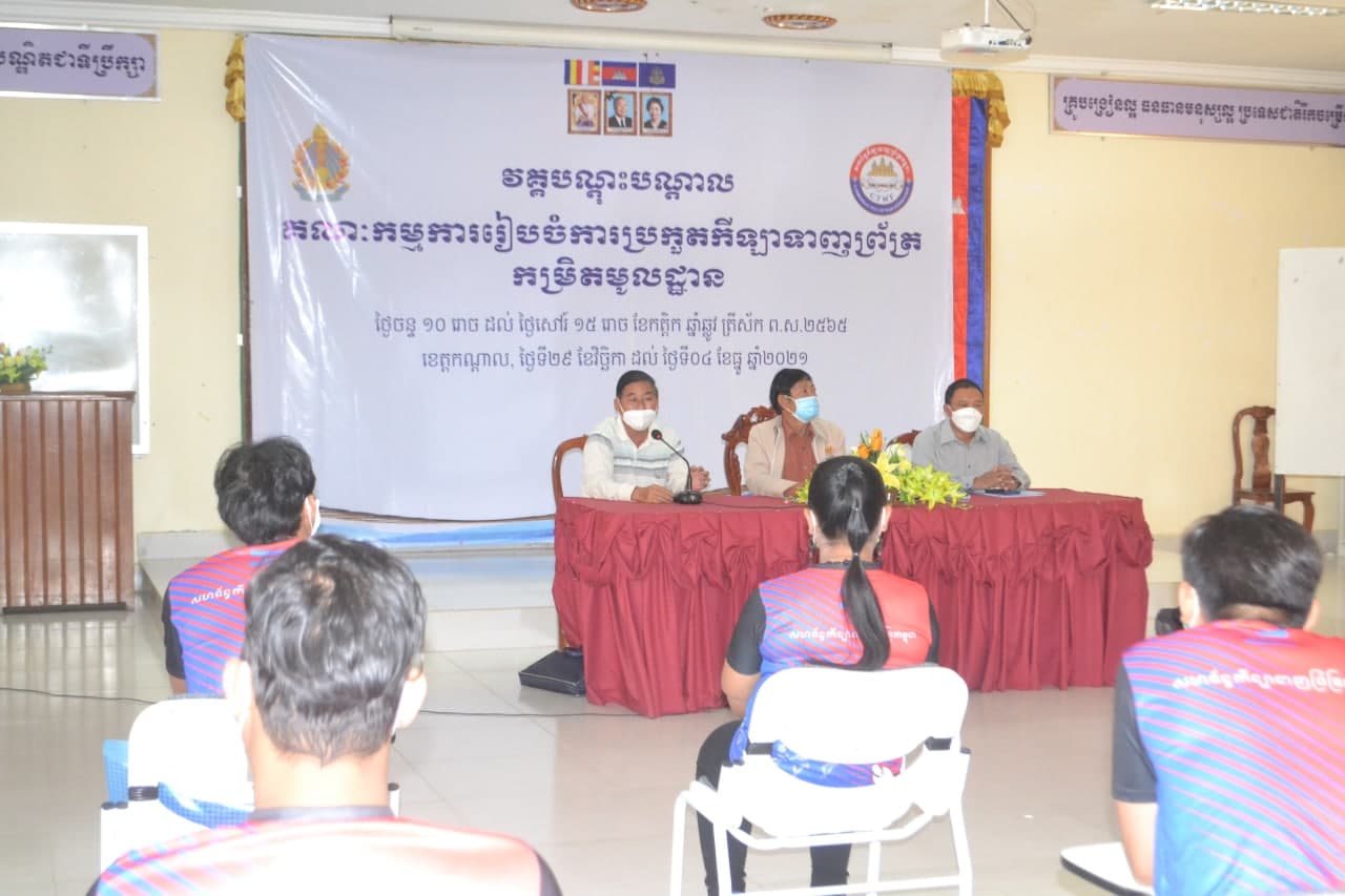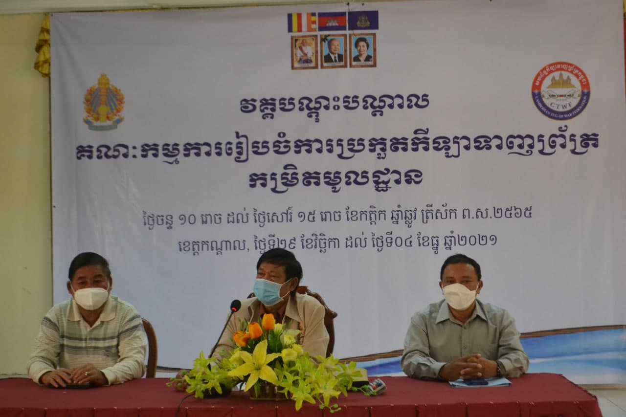 ភ្នំពេញ៖នាព្រឹកថ្ងៃទី២ ខែធ្នូ ឆ្នាំ២០២១នេះសហព័ន្ធកីឡាទាញព្រ័ត្រកម្ពុជាបានរៀបចំ វគ្គបណ្តុះបណ្តាលគណៈកម្មការរៀបចំការប្រកួតកីឡាទាញព្រ័ត្រកមិ្រតមូលដ្ឋានដែលមានរយៈពេល៣ថ្ងៃនៅសាលប្រជុំនៃមន្ទីរអប់រំកាយ និងកីឡាខេត្តកណ្តាល ក្នុងឳកាសបើកវគ្គជាផ្លូវការ ដោយមានការអញ្ជើញចូលរួមពីសំណាក់លោក ឯម ហៀង អនុប្រធានតំណាងឲ្យលោកបណ្ឌិត មាស សារិន ប្រធានសហព័ន្ធ លោក ពៅ វណ្ណា ប្រធានការិយាល័យកីឡា និងពេជ្រ ណារ៉េត អនុប្រធានការិយាល័យកីឡាខេត្តកណ្តាល ក្រោមការប្រើប្រាស់ថវិកាឧបត្ថម្ភរបស់ក្រសួងអប់រំ យុវជន និងកីឡា។