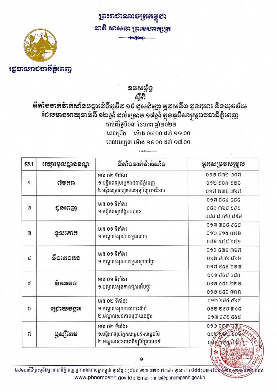 ភ្នំពេញ៖ រដ្ឋបាលរាជធានីភ្នំពេញ នឹងដំណើរការចាក់វ៉ាក់សាំងបង្ការជំងឺកូវីដ–១៩ ដូសជំរុញ ឬដូសទី៣ ជូនដល់កុមារនិងយុវវ័យ ដែលមានអាយុចាប់ពី១២ឆ្នាំ ដល់ក្រោម១៨ឆ្នាំ ដែលបានចាក់វ៉ាក់សាំងបង្ការជំងឺកូរីដ–១៩ ដួសទី១ និងដាសទី២រួច ហើយមានគម្លាតរយៈពេលចាប់ពី៤ខែឡើង បន្ទាប់ពីការចាក់ដូសទី២ ក្នុងភូមិសាស្ត្ររាជធានីភ្នំពេញ ចាប់ផ្តើមពីថ្ងៃទី០៣ ខែមករា ឆ្នាំ២០២២ នៅទីតាំងចំនួន៤២ ក្នុងមូលដ្ឋានខណ្ឌទាំង១៤ ។