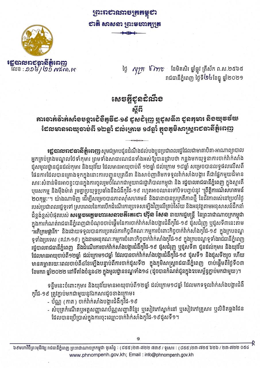 នេះបើយោងតាមសេចក្តីជូនដំណឹងរបស់រដ្ឋបាលរាជធានីភ្នំពេញនៅព្រឹកថ្ងៃទី២៤ធ្នូនេះ ដែលក្នុងសេចក្តីជូនដំណឹងនេះមានន័យថា ៖ រដ្ឋបាលរាជធានីភ្នំពេញ សូមជម្រាបជូនដំណឹងដល់បងប្អូនប្រជាពលរដ្ឋដែលជាមាតាបិតា–អាណាព្យាបាល អ្នកគ្រប់គ្រងមណ្ឌលថែទាំកុមារ ព្រមទាំងសាធារណជនទាំងអស់ឱ្យបានជ្រាបថា កន្លងមកយុទ្ធនាការចាក់វ៉ាក់សាំង ដូសមូលដ្ឋានជូនដល់កុមារ និងយុវវ័យ ដែលមានអាយុចាប់ពី ១២ឆ្នាំ ដល់ក្រោម ១៨ឆ្នាំសម្រេចបានលទ្ធផលលើសពី ផែនការដែលបានគ្រោងទុកក្នុងនោះការបញ្ជូនបុត្រធីតា និងសាច់ញាតិមកទទួលវ៉ាក់សាំងបង្ការ គឺជាផ្នែកមួយដ៏មាន សារៈសំខាន់មិនអាចខ្វះបានក្នុងការចូលរួមចំណែកជាមួយរាជរដ្ឋាភិបាលកម្ពុជា និងរដ្ឋបាលរាជធានីភ្នំពេញ ក្នុងស្មារតី បុរេសកម្ម និងម៉ឺងម៉ាត់ រួមគ្នាប្រយុទ្ធប្រឆាំងនឹងជំងឺកូវីង–១៩ រហូតអាចឈានទៅបិទបញ្ចប់នូវ “ព្រឹត្តិការណ៍សហគមន៍ ២០កុម្ភៈ”។ យ៉ាងណាមិញ ដើម្បីសម្រេចបានភាពស៊ាំសហគមន៍ និងធានាបានប្រក្រតីភាពថ្មី នៃជីវភាពរស់នៅប្រចាំថ្ងៃ របស់ប្រជាពលរដ្ឋទូទៅ ស្របពេលនៃការបើកដំណើរការប្រទេសឡើងវិញលើគ្រប់វិស័យ និងអនុវត្តតាមអនុសាសន៍ដឹកនាំ ដ៏ខ្ពង់ខ្ពស់បំផុតរបស់ សម្ដេចអគ្គមហាសនាបតីតេជោ ហ៊ុន សែននាយករដ្ឋមន្ត្រី នៃព្រះរាជាណាចក្រកម្ពុជា ក្នុងការកំណត់រាជធានីភ្នំពេញជាចំណុចចាប់ផ្តើមនៃការចាក់វ៉ាក់សាំងបង្ការជំងឺកូវីដ–១៩ ដូសជំរុញ ឬដូសទី៣នេះតាម “អភិក្រមផ្ការីក និងដោយទទួលបានការប្រគល់ភារកិច្ចពីគណៈកម្មការចំពោះកិច្ចចាក់វ៉ាក់សាំងកូវីដ–១៩ ក្នុងក្របខណ្ឌ ទូទាំងប្រទេស (គ.វ.ក–១៩) ក្នុងនាមអនុគណៈកម្មការចំពោះកិច្ចចាក់វ៉ាក់សាំងកូវីដ–១៩ ក្នុងក្របខណ្ឌទូទាំងរាជធានីភ្នំពេញ រដ្ឋបាលរាជធានីភ្នំពេញ នឹងដំណើរការចាក់វ៉ាក់សាំងបង្ការជំងឺកូវីដ–១៩ ដូសជំរុញ ឬដូសទី៣ ជូនដល់កុមារ និងយុវវ័យ ដែលមានអាយុចាប់ពី១២ឆ្នាំ ដល់ក្រោម១៨ឆ្នាំ ដែលបានចាក់វ៉ាក់សាំងបង្ការជំងឺកូរីដ–១៩ ដួសទី១ និងដាសទី២រួច ហើយ មានគម្លាតរយៈពេលចាប់ពី៤ខែឡើងបន្ទាប់ពីការចាក់ដូសទី២ ក្នុងភូមិសាស្ត្ររាជធានីភ្នំពេញ ចាប់ផ្តើមពីថ្ងៃទី០៣ ខែមករា ឆ្នាំ២០២២ នៅទីតាំងចំនួន៤២ ក្នុងមូលដ្ឋានខណ្ឌទាំង១៤ (ដូចបានកំណត់ជូនក្នុងឧបសម្ព័ន្ធភ្ជាប់មកជាមួយ)។