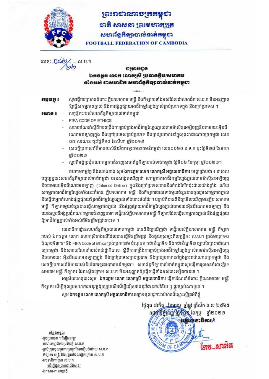 ក្នុងលិខិតមួយដែលចុះហត្ថលេខាដោយលោកកែវ សារ៉េតអគ្គលេខាធិការសហព័ន្ធកីឡាបាល់ទាត់កម្ពុជាបានបញ្ជាក់ថានាពេល