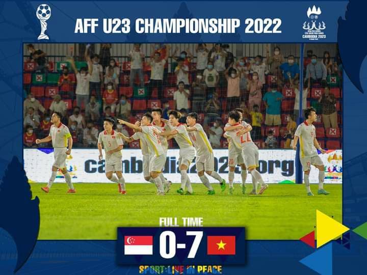 ភ្នំពេញ៖ ព្រឹត្តិការណ៍AFF U-23 Championship 2022 នាថ្ងៃទី១៩កុម្ភៈ ក្រុមយុវជនអាយុក្រោម២៣ឆ្នាំ របស់វៀតណាមប្រកួតឈ្នះ ក្រុមយុវជនអាយុក្រោម២៣ឆ្នាំ មកពីប្រទេសសឹង្ហបូរី៧ទល់០ ។