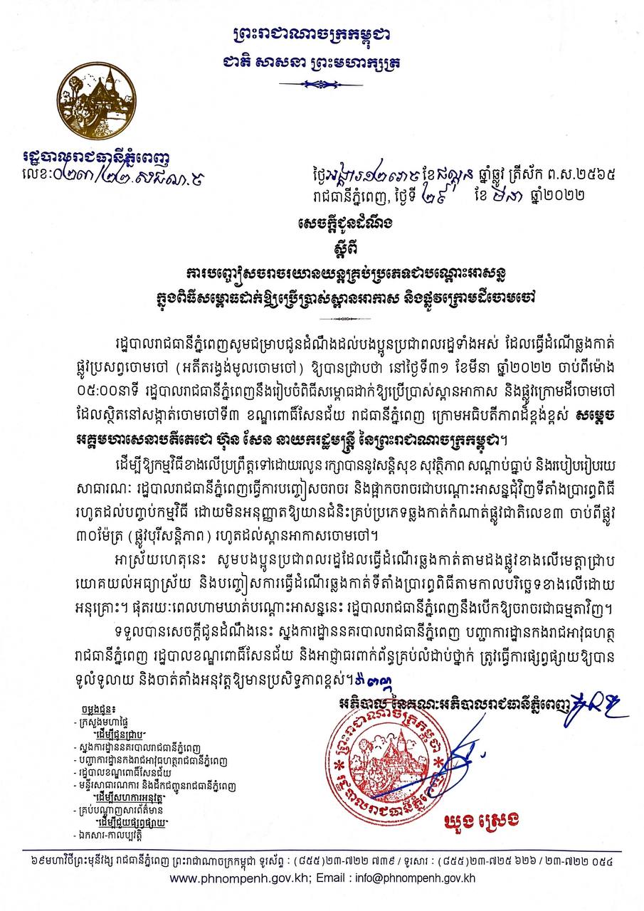 នេះបើយោងតាមសេចក្តីជូនដំណឹងរបស់រដ្ឋបាលរាជធានីភ្នំពេញ ដែលក្នុងសេចក្តីជូនដំណឹងនេះមានន័យថា៖