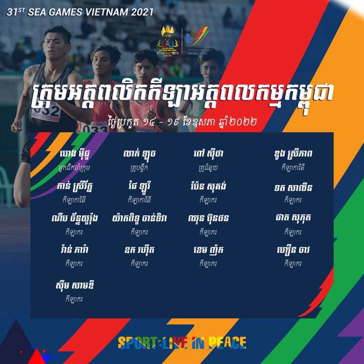ភ្នំពេញ៖ ខាងក្រោមនេះ ជាសមាសភាព ប្រធានប្រតិភូ គ្រូបង្វឹក និងកីឡាករ កីឡាការិនី កីឡាអត្តពលកម្មកម្ពុជា ដែលនឹងត្រូវចូលរួមការប្រកួតកីឡាស៊ីហ្គេម លើកទី៣១ នៅទីក្រុងហាណូយ ប្រទេសវៀតណាម ចាប់ផ្ដើមប្រកួតពីថ្ងៃទី១៤-១៩ ខែឧសភា ឆ្នាំ២០២២ ខាងមុខនេះ។
