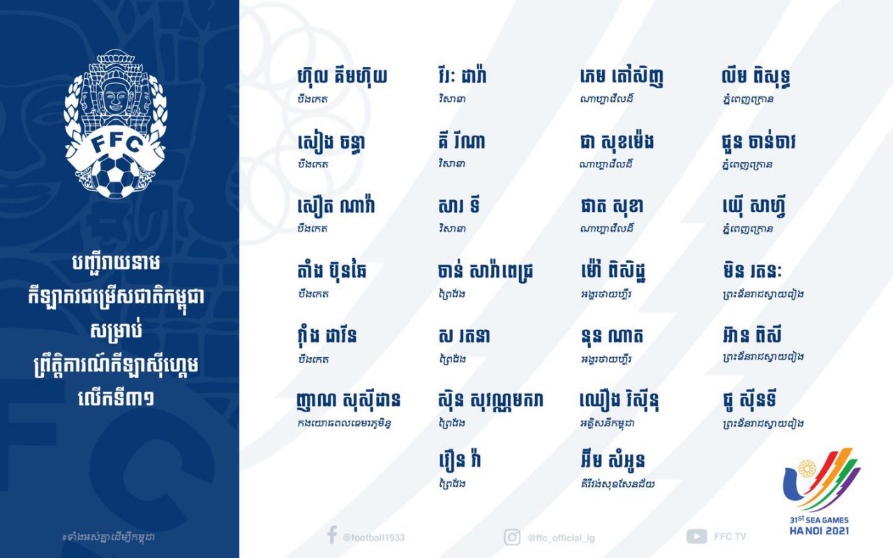 ភ្នំពេញ៖ម្សិលម៉ិញនេះ(២៥មេសា)សហព័ន្ធកីឡាបាល់ទាត់កម្ពុជាបានបង្ហាញពីបញ្ជីឈ្មោះបឋម នៃក្រុមបាល់ទាត់ជម្រើសជាតិអាយុក្រោម២៣ឆ្នាំសម្រាប់ចេញទៅប្រកួតកីឡាស៊ីហ្គេមលើកទី៣១នៅទីក្រុងហាណូយប្រទេសវៀតណាមហើយ ។