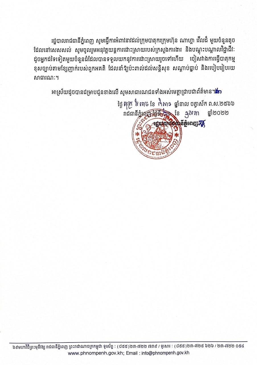 រដ្ឋបាលរាជធានីភ្នំពេញ សូមធ្វើការអំពាវនាវដល់ក្រុមបាតុករក្រុមហ៊ុន ណាហ្គាវើលដ៏ មួយចំនួនតូច ដែលនៅសេសសល់ សូមចូលរួមអនុវត្តយន្តការដោះស្រាយរបស់ក្រសួងការងារ និងបណ្តុះបណ្តាលវិជ្ជាជីវៈ ដូចអ្នកដទៃទៀតមួយចំនួនធំដែលបានទទួលយកនូវការដោះស្រាយរួចទៅហើយ ចៀសវាងការធ្វើបាតុកម្ម ខុសច្បាប់តាមខ្សែញាក់របស់ពួកអគតិ ដែលនាំឱ្យប៉ះពាល់ដល់សន្តិសុខ សណ្តាប់ធ្នាប់ និងរបៀបរៀបរយ សាធារណៈ៕
