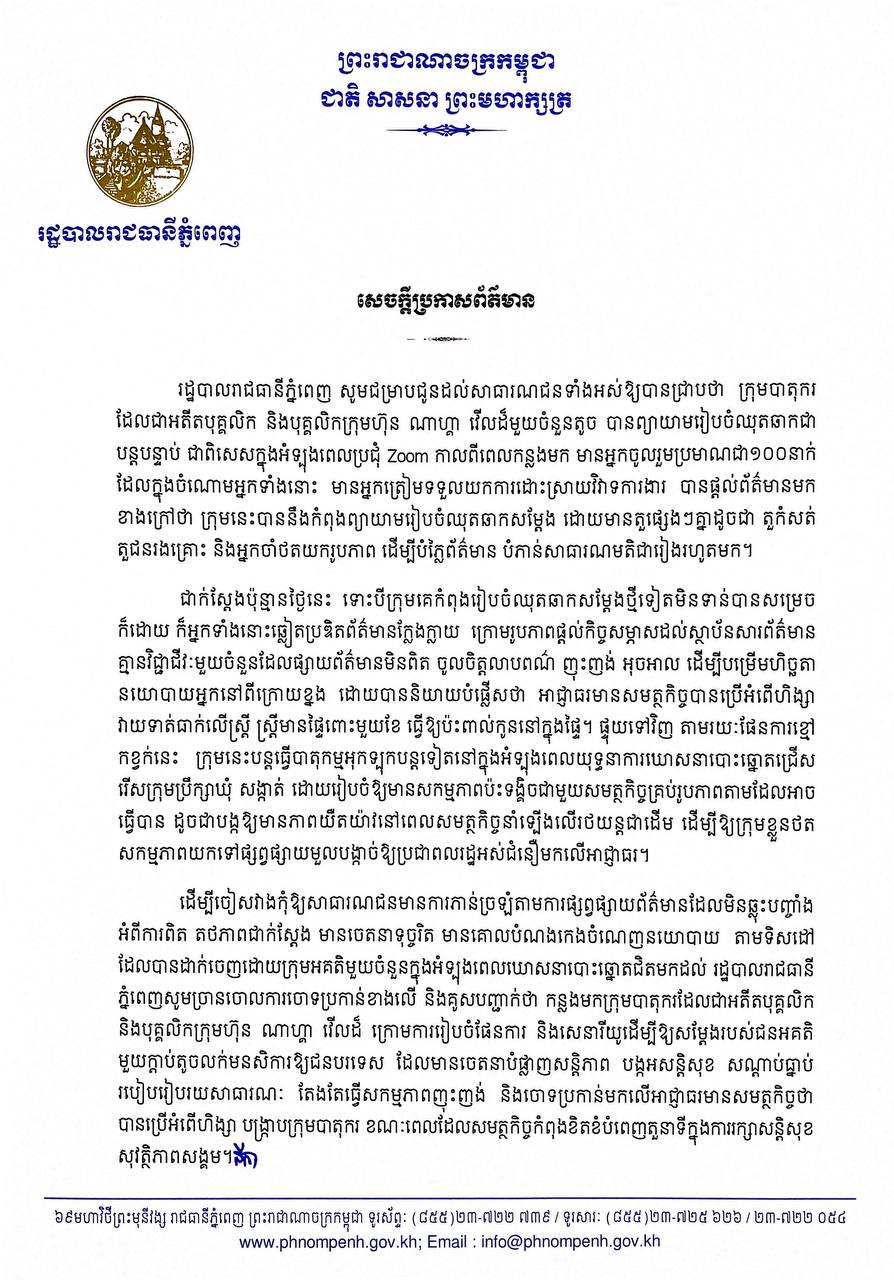 នេះបើយោងតាមសេចក្តីប្រកាសព័ត៍មានរបស់រដ្ឋបាលរាជធានីភ្នំពេញនៅថ្ងៃទី២០ ឧសភានេះ ដែលក្នុងសេចក្តីប្រកាសព័ត៍មាននេះ មានន័យថា៖  រដ្ឋបាលរាជធានីភ្នំពេញ សូមជម្រាបជូនដល់សាធារណជនទាំងអស់ឱ្យបានជ្រាបថា ក្រុមបាតុករ ដែលជាអតីតបុគ្គលិក និងបុគ្គលិកក្រុមហ៊ុន ណាហ្គាវើលដ៏មួយចំនួនតូច បានព្យាយាមរៀបចំឈុតឆាកជាបន្តបន្ទាប់ ជាពិសេសក្នុងអំឡុងពេលប្រជុំ Zoom កាលពីពេលកន្លងមក មានអ្នកចូលរួមប្រមាណជា១០០នាក់ ដែលក្នុងចំណោមអ្នកទាំងនោះ មានអ្នកត្រៀមទទួលយកការដោះស្រាយវិវាទការងារ បានផ្ដល់ព័ត៌មានមក ខាងក្រៅថាក្រុមនេះបាននឹងកំពុងព្យាយាមរៀបចំឈុតឆាកសម្តែង ដោយមានតួផ្សេងៗគ្នាដូចជា តួកំសត់ តួជនរងគ្រោះ និងអ្នកចាំថតយករូបភាព ដើម្បីបំភ្លៃព័ត៌មាន បំភាន់សាធារណមតិជារៀងរហូតមក។