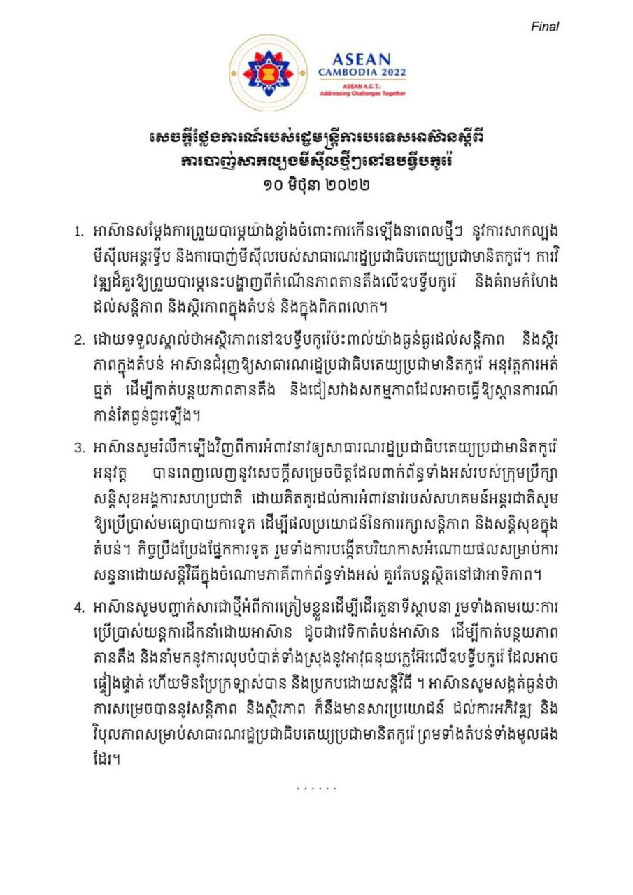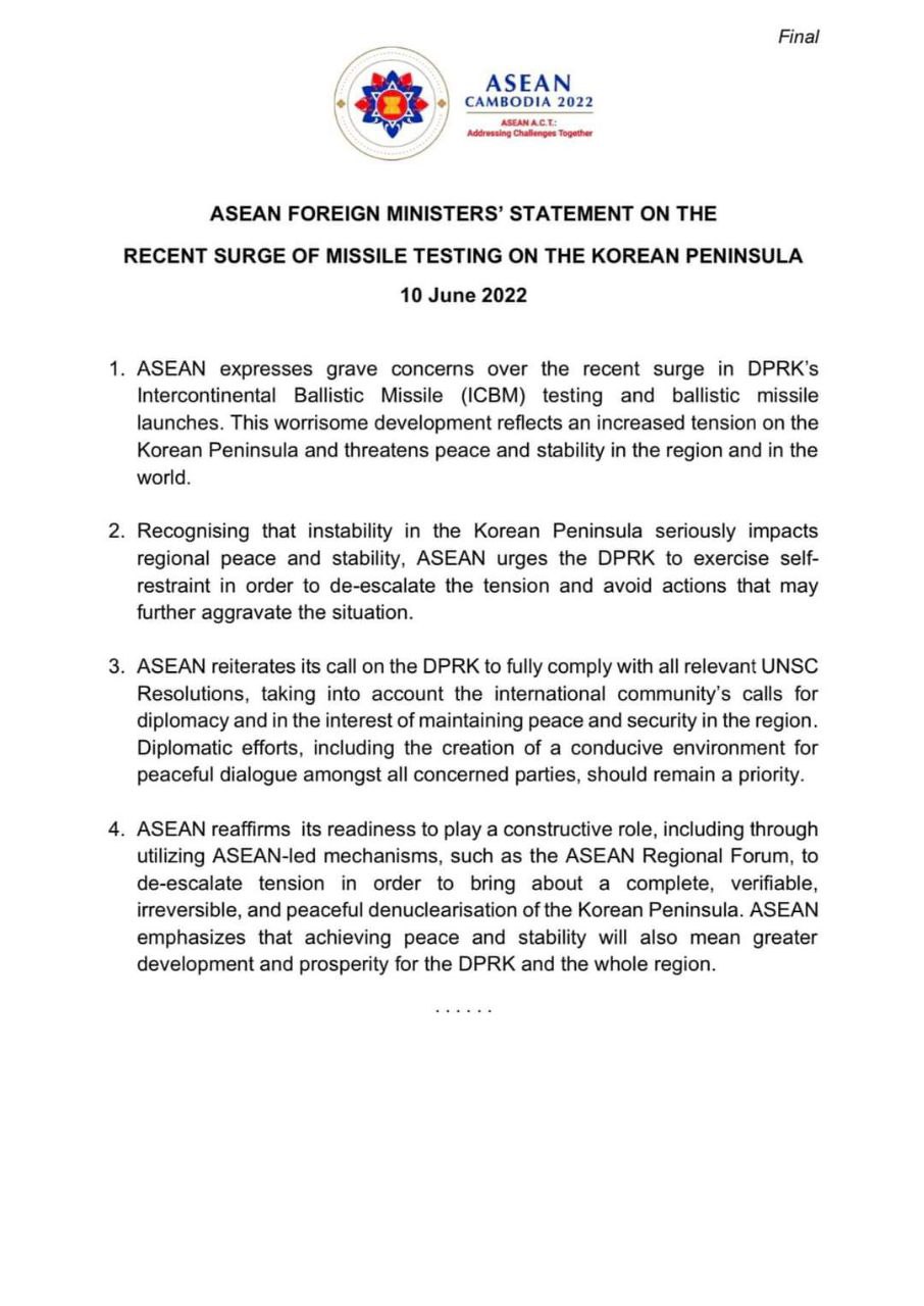 ភ្នំពេញ៖ សេចក្តីថ្លែងការណ៍របស់រដ្ឋមន្ត្រីការបរទេសអាស៊ាន ស្តីពីការបាញ់សាកល្បងមីស៊ីលថ្មីៗនៅឧបទ្វីបកូរ៉េ ថ្ងៃទី១០ ខែមិថុនា ឆ្នាំ២០២២។