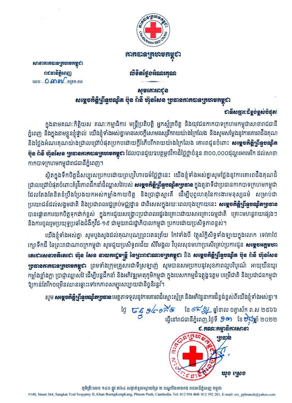 ស្ថិតក្នុងទឹកចិត្តដ៏សប្បុរសប្រកបដោយព្រហ្មវិហារធម៌ថ្លៃថ្លានេះ យើងខ្ញុំទាំងអស់គ្នាសូមថ្លែងនូវការគោរពដឹងគុណដ៏ជ្រាលជ្រៅបំផុតចំពោះគំរូវីរភាពដឹកនាំដ៏ឈ្លាសវៃរបស់សម្តេចកិត្តិព្រឹទ្ធបណ្ឌិតប្រធាន ក្នុងតួនាទីជាប្រធានកាកបាទក្រហមកម្ពុជា ដែលតែងតែខិតខំប្រឹងប្រែងយកអស់កម្លាំងកាយចិត្ត និងប្រាជ្ញាស្មារតី ដើម្បីបុព្វហេតុនៃការងារមនុស្សធម៌ សម្រាប់ជាប្រយោជន៍ដល់សង្គមជាតិ និងប្រជាពលរដ្ឋគ្រប់មជ្ឈដ្ឋាន ជាពិសេសក្នុងរយៈពេលចុងក្រោយនេះ សម្ដេចកិត្តិព្រឹទ្ធបណ្ឌិតប្រធាន បានផ្ដោតការយកចិត្តទុកដាក់ខ្ពស់ ក្នុងការជួយសង្គ្រោះប្រជាពលរដ្ឋរងគ្រោះដោយសារគ្រោះធម្មជាតិ គ្រោះមហន្តរាយផ្សេងៗ និងការចូលរួមប្រយុទ្ធប្រឆាំងជំងឺកូវីដ១៩ ជាមួយរាជរដ្ឋាភិបាលកម្ពុជា ប្រកបដោយប្រសិទ្ធភាពខ្ពស់។