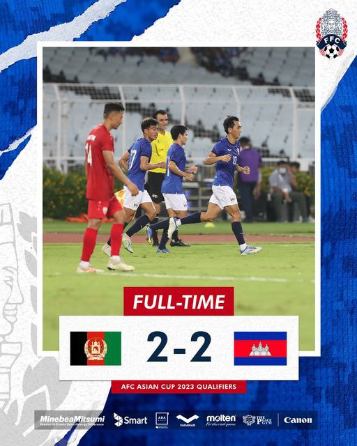ភ្នំពេញ៖ក្រុមបាល់ទាត់ជម្រើសជាតិកម្ពុជាបានបញ្ចប់បេសកកម្មក្នុងព្រឹត្តិការណ៍ AFC Asian Cup 2023 Qualifiers Final Round បន្ទាប់ពីប្រកួតចុងក្រោយស្មើជាមួយក្រុមជម្រើសជាតិអាហ្វហ្គានីស្ថាន២ទល់២នោះ ។