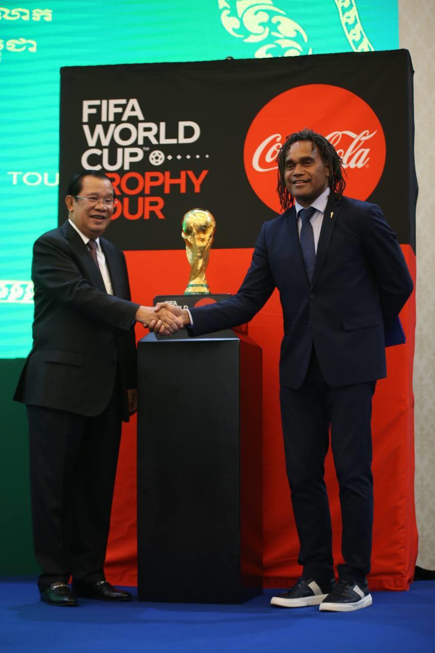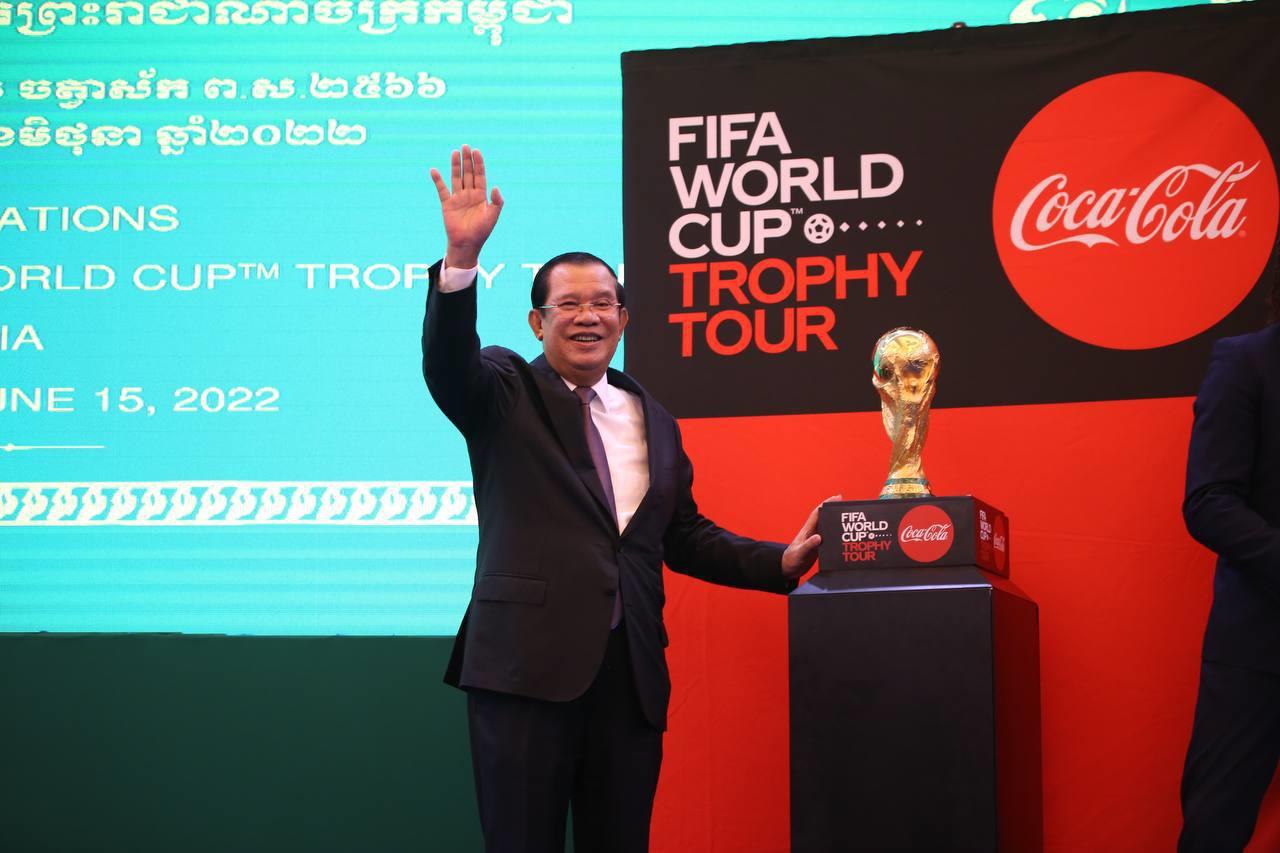 សម្តេចតេជោនាយករដ្ឋមន្ត្រី បានបង្ហាញនូវមោទនភាព និងសេចក្តីរីករាយក្រៃលែង ដោយបានទទួលស្វាគមន៍ និងលើកពានរង្វាន់បាល់ទាត់ពិភពលោក (FIFA World Cup Trophy Tour) ជាលើកដំបូង។