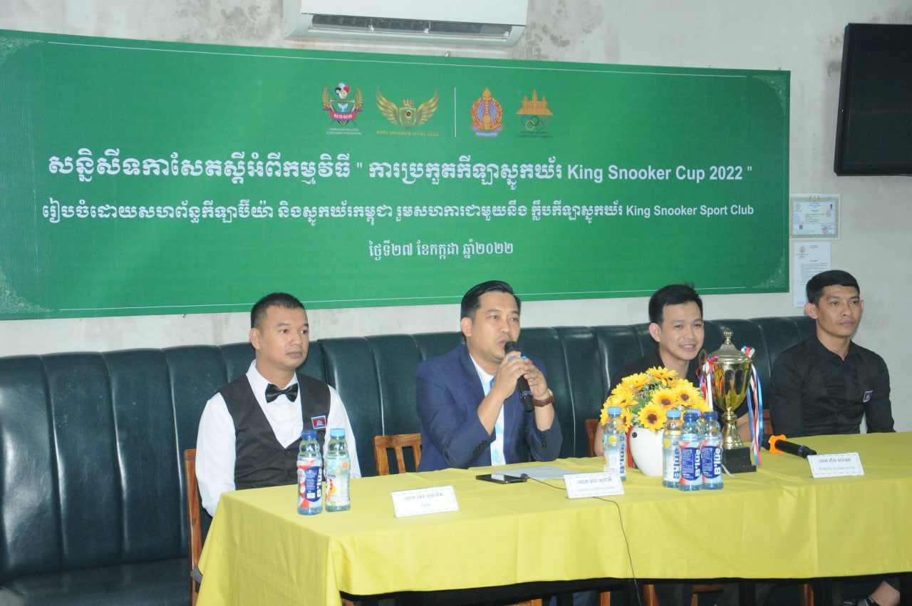 ភ្នំពេញ៖ថ្ងៃទី២៧ ខែកក្កដា ឆ្នាំ២០២២ លោក ម៉ារ៉ា សុជាតិ អគ្គលេខាធិការនៃសហព័ន្ធកីឡាប៊ីយ៉ា និងស្នូកឃ័រកម្ពុជា លោក ហ៊ុល សារ៉ាវុធ ម្ចាស់ក្លិបកីឡាស្នូកយ័រ KING SNOOKER SPORT CLUB កីឡាករ ម៉ែន សុផានិត និងកីឡាករ សួន ឆាយបានធ្វើសន្និសីទកាសែតស្ដីអំពីរៀបចំព្រឹត្តិការណ៍ការប្រកួតកីឡាស្នូកឃ័រពាន់រង្វាន់ king Snooker Cup 2022 នៅក្លិបកីឡាស្នូកយ័រ KING SNOOKER SPORT CLUB។