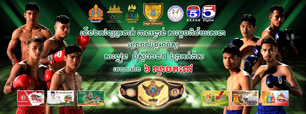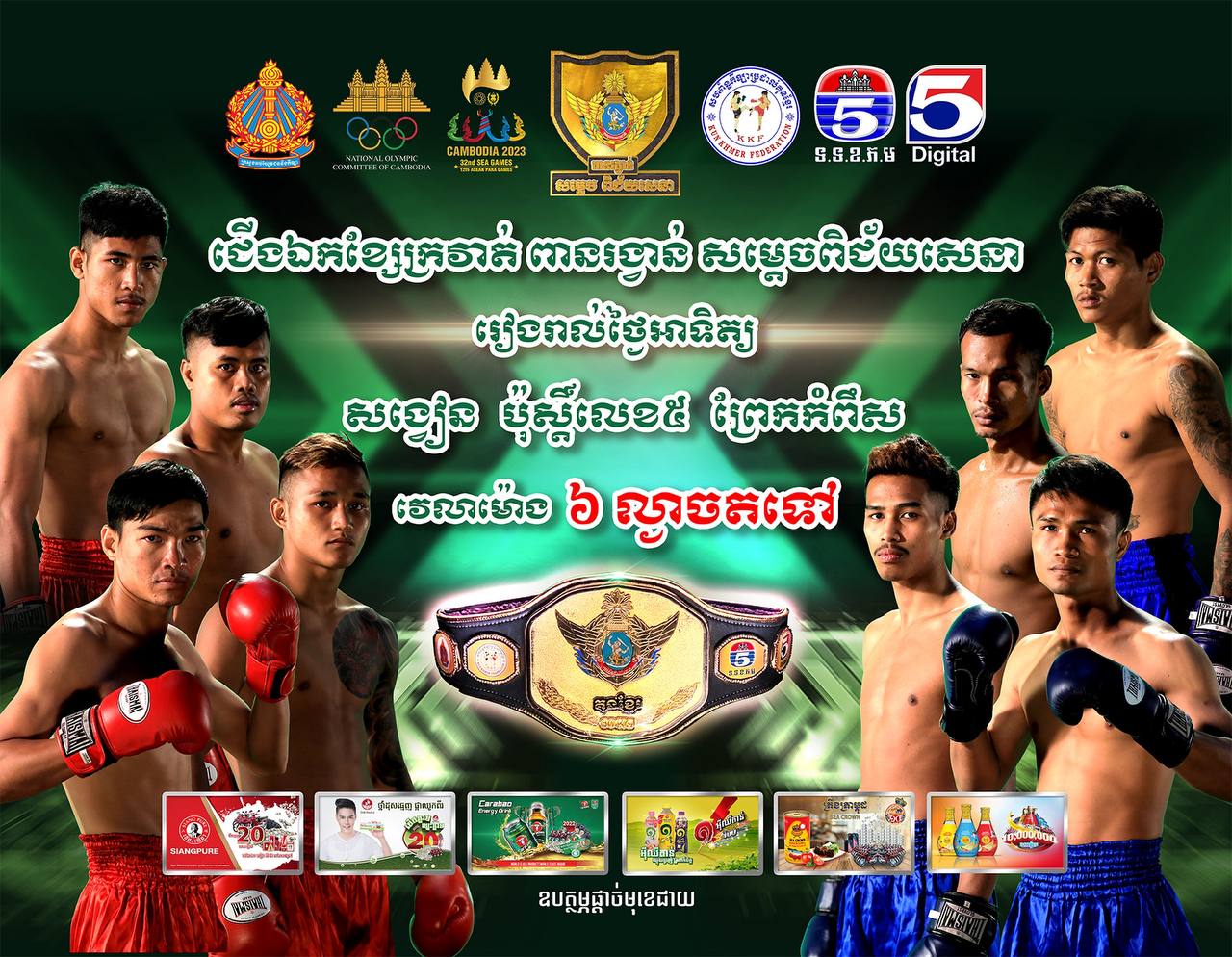 ភ្នំពេញ៖ព្រឹត្តិការន៍ប្រកួតប្រដាល់គុនខ្មែរដណ្ដើមខ្សែក្រវាត់ពានរង្វាន់សម្ដេចពិជ័យសេនាទៀបាញ់ទម្ងន់៦០គីឡូក្រាមលើសង្វៀនTV5ថ្ងៃទី២តុលាខាងមុខនេះមានការប្រកួតចំនួន២គូ។
