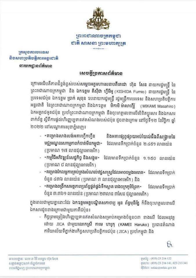 ភ្នំពេញ ៖ នៅថ្ងៃទី១២ ខែវិច្ឆិកា ឆ្នាំ២០២២នេះ រដ្ឋាភិបាលជប៉ុនបានផ្តល់ជំនួយដល់រាជរដ្ឋាភិបាលកម្ពុជា ប្រមាណ ៥១.៣លានដុល្លារអាមេរិក សម្រាប់ការអនុវត្តលើគម្រោងសំខាន់ៗចំនួន៤។