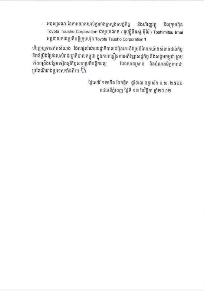 -អនុស្សារណៈនៃការយោគយល់គ្នារវាងក្រសួងសេដ្ឋកិច្ច និងហិរញ្ញវត្ថុ និង ក្រុមហ៊ុន Toyota Tsusho Corporation ជាមួយលោក (តូហ្ស៉ីមីតស៊ូ អ៉ីម៉ៃ) Toshimitsu Imal អគ្គនាយករងប្រតិបត្តិក្រុមហ៊ុន Toyota Tsusho Corporation។