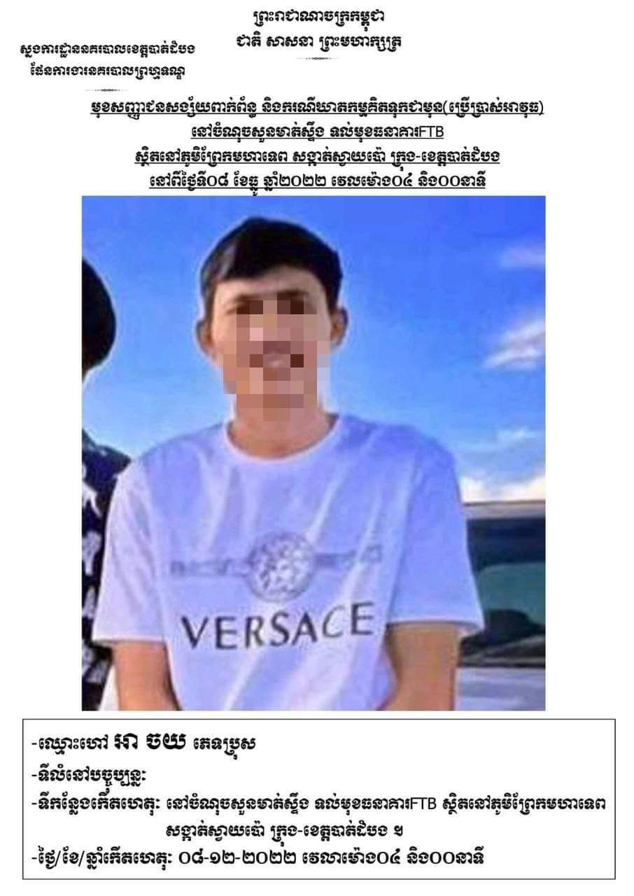 គួរបញ្ជាក់ថា កាលពីវេលាម៉ោង៤និង០០នាទីទៀបភ្លឺនៃ យប់ថ្ងៃទី ៧ខែធ្នូឆ្នាំ២០២២ឈានចូលថ្ងៃ ទី ០៨ ខែធ្នូ ឆ្នាំ២០ ២២ នៅចំណុចសួន ច្បារមាត់ស្ទឹងសង្កែ ត្រើយខាងលិចទល់មុខធនាគារFTB ស្ថិតនៅភូមិព្រែកមហាទេព សង្កាត់ស្វាយប៉ោ ក្រុងបាត់ដំបង ខេត្តបាត់ដំបង មានជនសង្ស័យមួយក្រុមបានបើករថយន្តមកដល់ចំនុចខាងលើ រួចបានយកកាំភ្លើងខ្លីបាញ់រះ លើយុវជនមួយក្រុមដែលកំពុងអង្គុយលេងជួបជុំគ្នា បណ្តាលឲ្យរងរបួសធ្ងន់ស្រាលចំនួន០៣នាក់ ដែលជំហ៊ានដំបូងត្រូវបានគេសន្និដ្ឋានថាជារឿងគំនុំ ភ្លាមៗនោះជនសង្ស័យបាននាំគ្នាជិះរត់យន្តគេចខ្លួនបាត់ស្រមោល។ ក្នុងហេតុការណ៍នោះជនរងគ្រោះ១នាក់ ក្នុងចំណោម៣នាក់ បានស្លា.ប់បាត់បង់ជីវិតពេលគេបញ្ជូនទៅសង្គ្រោះនៅមន្ទីរពេទ្យ។