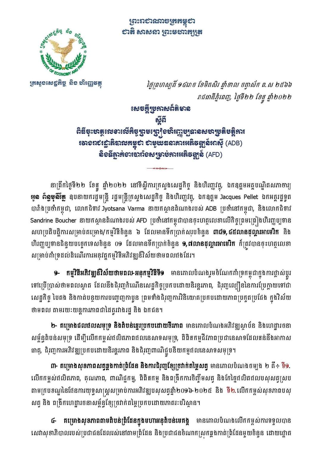 ភ្នំពេញ៖ ឯកឧត្តមអគ្គបណ្ឌិតសភាចារ្យ អូន ព័ន្ធមុនីរ័ត្ន ឧបនាយករដ្ឋមន្រ្តី រដ្ឋមន្រ្តីក្រសួងសេដ្ឋកិច្ច និងហិរញ្ញវត្ថុ, ឯកឧត្តម Jacques Pellet ឯកអគ្គរដ្ឋទូត បារាំងប្រចាំកម្ពុជា, លោកជំទាវ Jyotsana Varma នាយកស្ថានតំណាងរបស់ ADB ប្រចាំនៅកម្ពុជា, និងលោកជំទាវ Sandrine Boucher នាយកស្ថានតំណាងរបស់ AFD ប្រចាំនៅកម្ពុជាបានចុះហត្ថលេខាលើកិច្ចព្រមព្រៀងហិរញ្ញប្បទានសហប្រតិបត្តិការសម្រាប់គម្រោង/កម្មវិធីចំនួន ៦ ដែលមានទឹកប្រាក់សរុបចំនួន ៣៨១,៤៥លានដុល្លារអាមេរិក និងហិរញ្ញប្បទានជំនួយបច្ចេកទេសចំនួន ០១ ដែលមានទឹកប្រាក់ចំនួន ១,៧លានដុលា្លរអាមេរិក ក៏ត្រូវបានចុះហត្ថលេខា សម្រាប់គាំទ្រដល់ដំណើរការអនុវត្តកម្មវិធីអភិវឌ្ឍន៍វិស័យថាមពលផងដែរ, នាព្រឹកថ្ងៃទី២២ ខែធ្នូ ឆ្នាំ២០២២ នៅទីស្តីការក្រសួងសេដ្ឋកិច្ច និងហិរញ្ញវត្ថុ ។