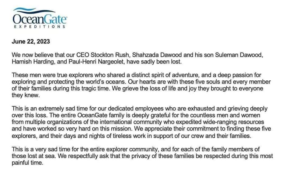 Ocean Gate បានប្រកាសជាផ្លូវការណ៍ហើយនៅមុននេះបន្តិចថា គេបានរកឃើញសំណល់កំទេចកំទីដែលជាផ្នែកសំខាន់របស់យាន្ត The TITAN នៅក្បែរសាកសពកប៉ាល់ TITANIC ប្រហែលជាង៥០០ម តែប៉ុណ្ណោះ – គេជឿថាយាន្តនោះបានផ្ទុះនៅក្រោមសមុទ្រ ហើយពួកគេទាំង៥នាក់ក៏ត្រូវគេជឿថាបានបាត់បង់ជីវិតទៅហើយដូចគ្នា។