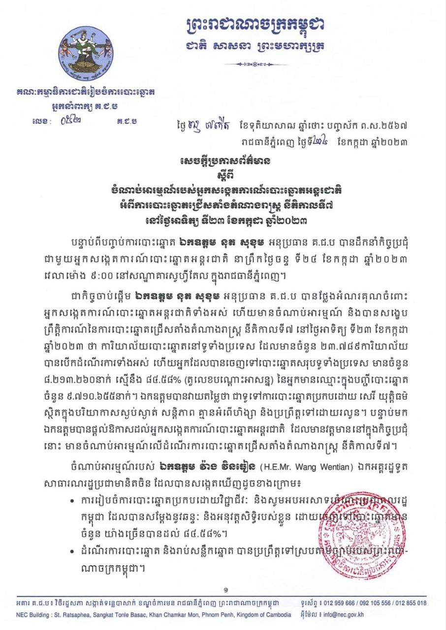 ភ្នំពេញ ៖ នៅថ្ងៃទី២៤ ខែកក្កដា ឆ្នាំ២០២៣ គណៈកម្មាធិការជាតិរៀបចំការបោះឆ្នោត បានចេញសេចក្តីប្រកាសព័ត៌មាន
