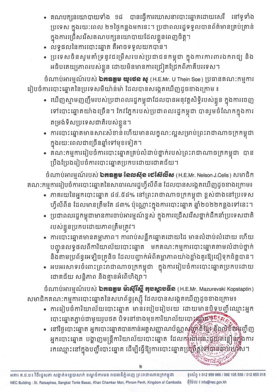 ការបោះឆ្នោតមានតម្លាភាព។ ការរាប់សន្លឹកឆ្នោតដោយដៃ មានលំដាប់លំដោយ ហើយ បញ្ជួនលទ្ធផលពីការិយាល័យបោះឆ្នោត មកគណៈកម្មការបោះឆ្នោតតាមលំដាប់ថ្នាក់ និងតាមប្រព័ន្ធអេឡិចត្រូនិច ដែលបញ្ជាក់អំពីតម្លាភាពយ៉ាងខ្លាំងគួរឱ្យជឿទុកចិត្តបាន។ អបអរសាទរចំពោះព្រះរាជាណាចក្រកម្ពុជា ក្នុងការរៀបចំការបោះឆ្នោតប្រកបដោយ ជោគជ័យ សន្តិភាព និងគ្មានអំពើហិង្សា។