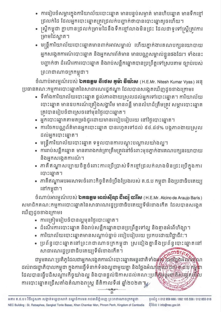 អំណរគុណដល់រាជរដ្ឋាភិបាលកម្ពុជា ក្នុងការធ្វើទំនាក់ទំនងល្អជាមួយគ្នា និងថ្លែងអំណរគុណ ដល់ គ.ជ.ប កម្ពុជា ដែលបានធ្វើបដិសណ្ឋារកិច្ចយ៉ាងល្អ និងបានផ្តល់ឱកាសដល់គណៈប្រតិភូអន្តរជាតិសង្កេតមើល ការបោះឆ្នោតជ្រើសតាំងតំណាងរាស្ត្រ នីតិកាលទី៧ ឆ្នាំ២០២៣៕