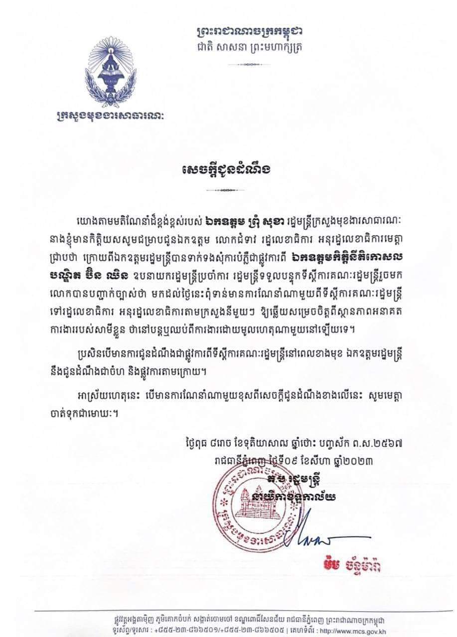 ភ្នំពេញ៖ នៅថ្ងៃទី ១០ខែសីហាឆ្នាំ ២០២៣ ក្រសួងមុខងារសាធារណៈបានចេញសេចក្តីជូនដំណឹងថា ពុំទាន់មានការណែនាំណាមួយពីទីស្តីការគណៈរដ្ឋមន្ត្រី ទៅរដ្ឋលេខាធិការ អនុរដ្ឋលេខាធិការតាមក្រសួងនីមួយៗ ឱ្យឆ្លើយសម្រេចចិត្តពីស្ថានភាពអនាគត ការងាររបស់សាមីខ្លួន ថានៅបន្តឬឈប់ពីការងារដោយមូលហេតុណាមួយនៅឡើយទេ។