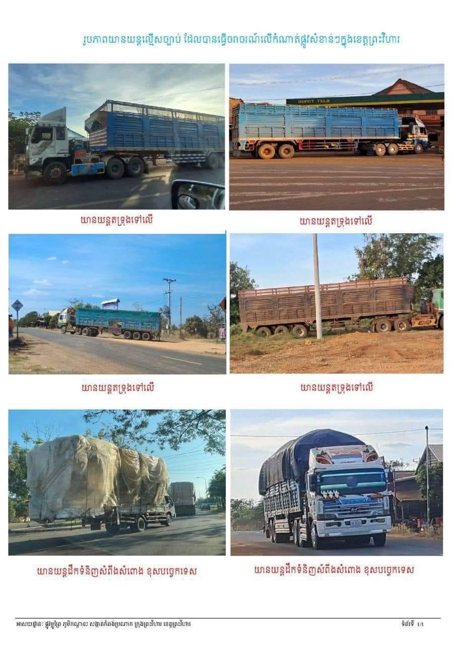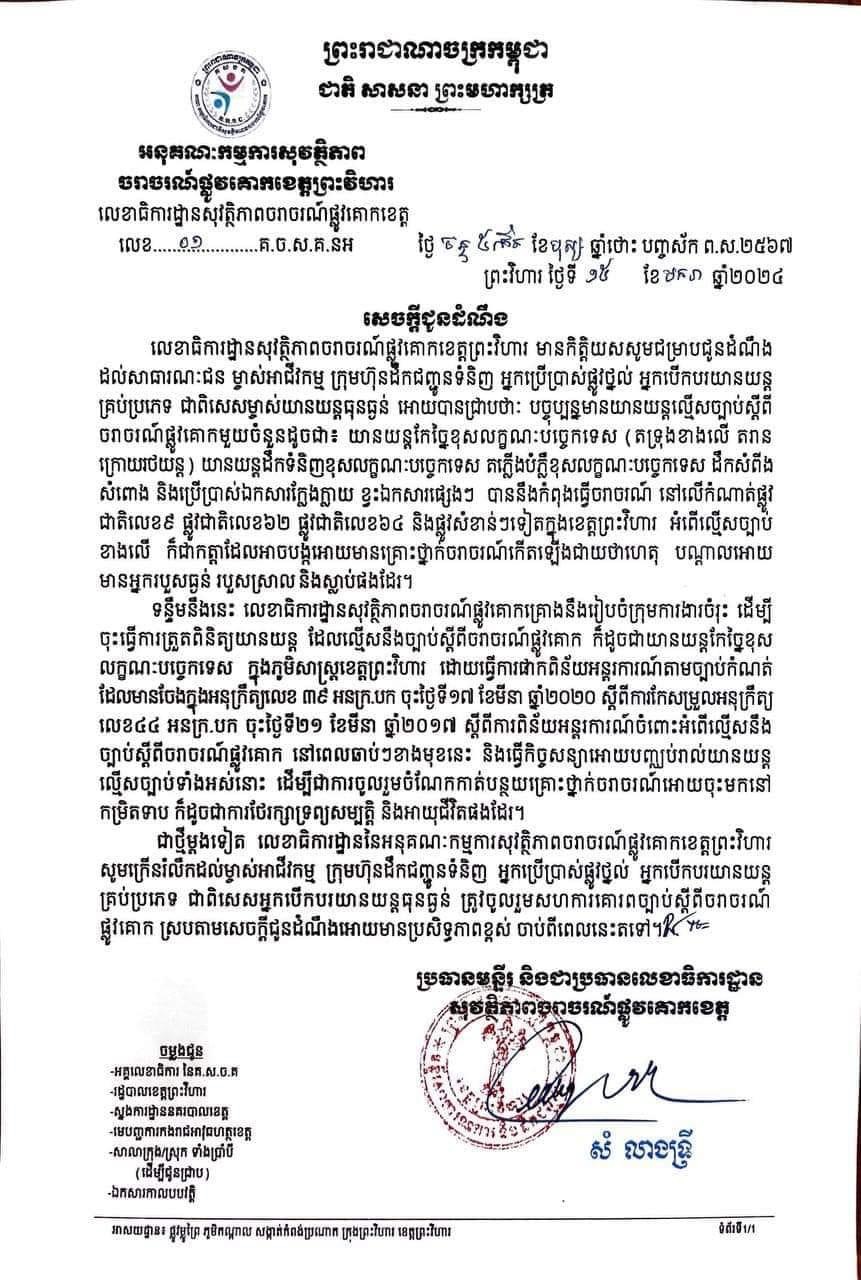 តាមសេចក្តីជូនដំណឹងដែលចុះហត្ថលេខាដោយលោក សំ លាងទ្រី ប្រធានមន្ទីរសាធារណការ និងដឹកជញ្ជូនខេត្តព្រះវិហារ បានអោយដឹងថា៖ លេខាធិការដ្ឋានសុវត្ថិភាពចរាចរណ៍ផ្លូវគោកខេត្តព្រះវិហារ មានកិត្តិយសសូមជម្រាបជូនដំណឹង ដល់សាធារណៈជន ម្ចាស់អាជីវកម្ម ក្រុមហ៊ុនដឹកជញ្ជូនទំនិញ អ្នកប្រើប្រាស់ផ្លូវថ្នល់ អ្នកបើកបរយានយន្ត គ្រប់ប្រភេទ ជាពិសេសម្ចាស់យានយន្តធុនធ្ងន់ អោយបានជ្រាបថាៈ បច្ចុប្បន្នមានយានយន្តល្មើសច្បាប់ស្តីពីចរាចរណ៍ផ្លូវគោកមួយចំនួនដូចជា៖ យានយន្តកែច្នៃខុសលក្ខណៈបច្ចេកទេស (តទ្រុងខាងលើ តរាន ក្រោយរថយ័ន្ត) យានយន្តដឹកទំនិញខុសលក្ខណៈបច្ចេកទេស តភ្លើងបំភ្លឺខុសលក្ខណៈបច្ចេកទេស ដឹកសំពីង សំពោង និងប្រើប្រាស់ឯកសារក្លែងក្លាយ ខ្វះឯកសារផ្សេងៗ បាននឹងកំពុងធ្វើចរាចរណ៍ នៅលើកំណាត់ផ្លូវ ជាតិលេខ៩ ផ្លូវជាតិលេខ៦២ផ្លូវជាតិលេខ៦៤ និងផ្លូវសំខាន់ៗទៀតក្នុងខេត្តព្រះវិហារ អំពើល្មើសច្បាប់ ខាងលើ ក៏ជាកត្តាដែលអាចបង្កអោយមានគ្រោះថ្នាក់ចរាចរណ៍កើតឡើងជាយថាហេតុ បណ្ដាលអោយ មានអ្នករបួសធ្ងន់ របួសស្រាល និងស្លាប់ផងដែរ។