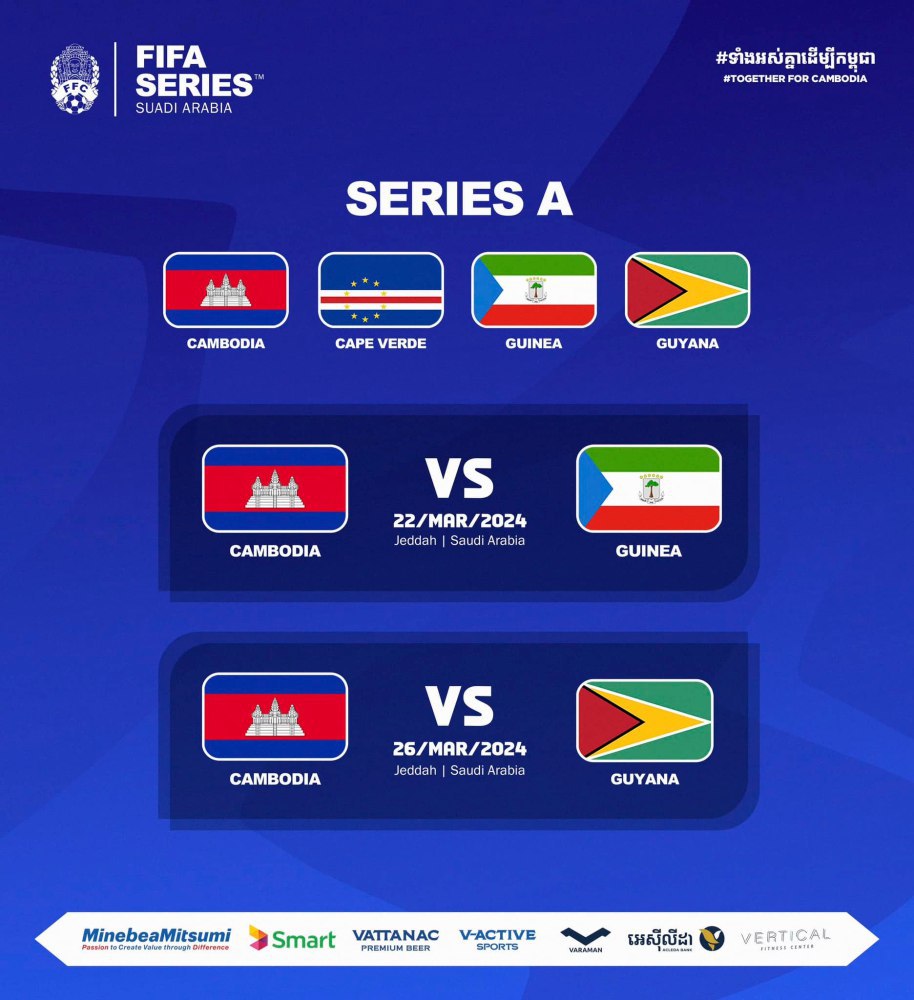 ភ្នំពេញ៖ក្រុមជម្រើសជាតិកម្ពុជានឹងចូលរួមការប្រកួតមិត្តភាពអន្តរជាតិ FIFA Series រៀបចំឡើងដោយសហព័ន្ធកីឡាបាល់ទាត់ពិភពលោក (FIFA) ពីថ្ងៃទី១៨ ដល់ថ្ងៃទី២៦ខែមីនា ឆ្នាំ២០២៤។